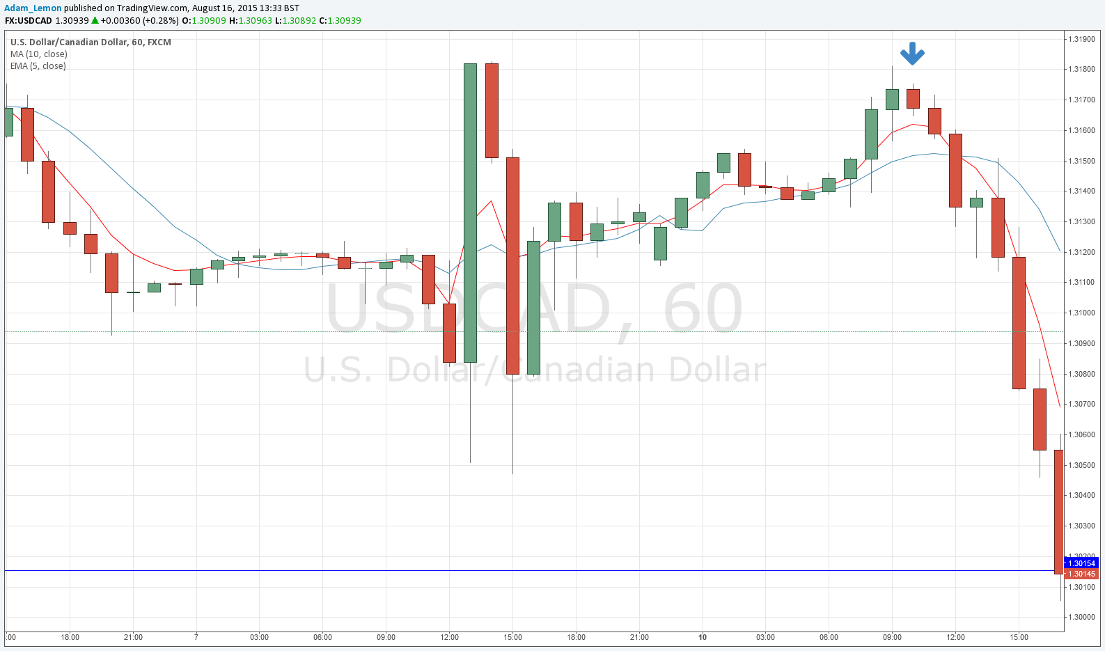 On an hourly candlestick trading chart, add two indicators: a 5 period exponential moving average and a 10 period simple moving average, both set to close.