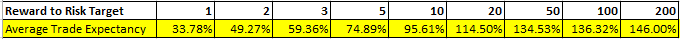 At the reward to risk target of 1 – that is to say, if the risk to the stop loss was 20 pips, the trade exit would be at +20 pips – the worst peak to trough drawdown over this 15 years plus period was only -14 units of risk.