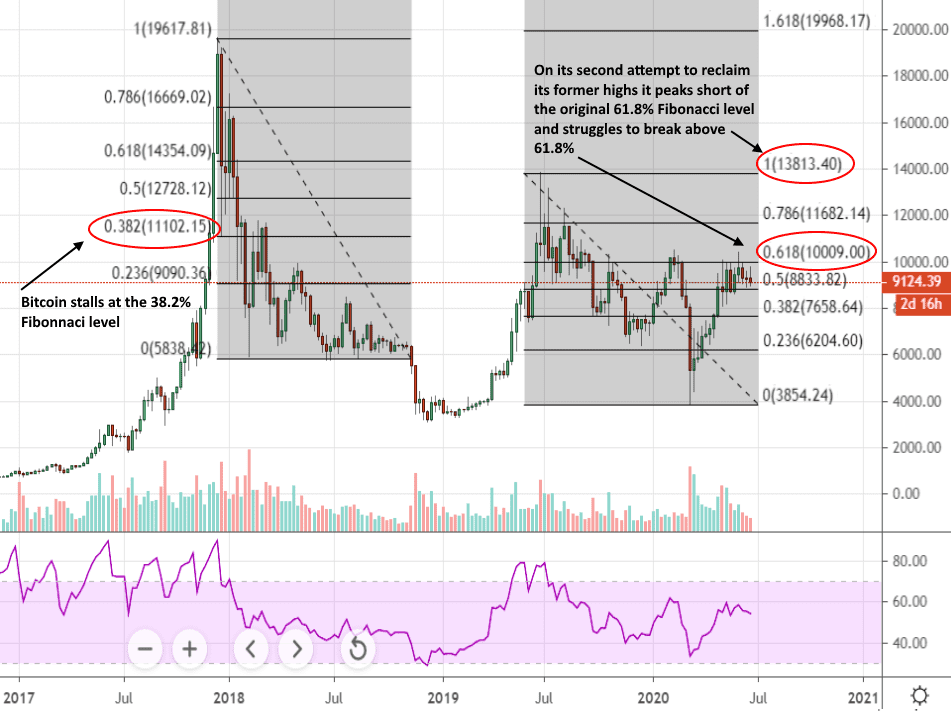 Similar to the previous chart, after hitting its lows of February 2018, Bitcoin rebounds but barely makes it above the 38.2% retracement. This is followed by a series of lower-highs that carry on well into 2019. The second peak in 2019 is rejected from roughly the 61.8% retracement level of the initial bubble which is at, or around, $14,000. Just as in the above chart, the price attempts to reclaim former highs, but falls short, creating a smaller version of the first pattern.