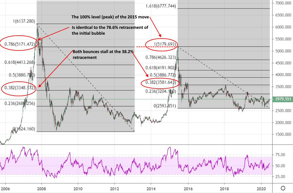 In many ways, Bitcoin’s meteoric rise and fall between 2017 and 2019 is the mother of all bubbles. This is because it was the perfect combination of a new type of asset (reminiscent of tulip mania), a very short run-up (less than a year), and a truly epic run that minted a large number of new millionaires (more than 2000% in a single year). When you plot Fibonacci retracements onto the 2017 bubble, as well as the second move up we saw in 2019, you start to see some interesting parallels with the previous chart of the Shanghai Composite Index.