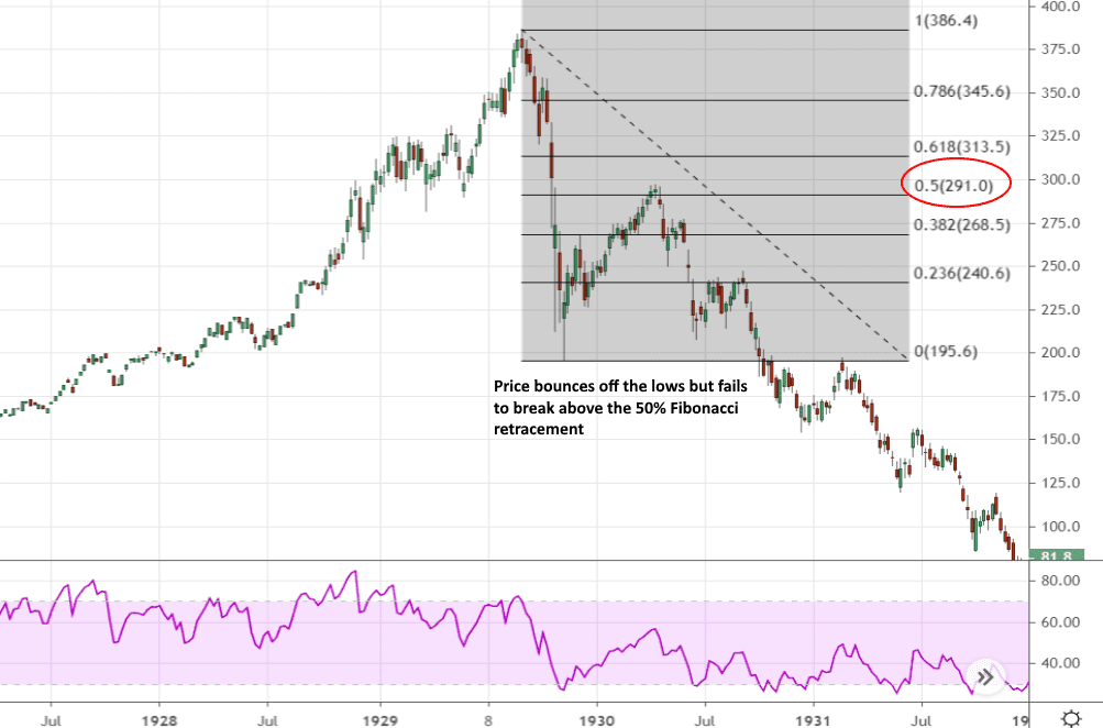 The following image is of the Dow Jones Industrial Average, again at the weekly time frame. It describes the price action in the run-up to the stock market crash of 1929, followed by the attempted bounce, and the prolonged fall in asset prices during the Great Depression. In this case, we have a more pronounced drop, as well as what looks like the beginning of a V-shaped recovery that stalls in April of 1930, barely managing to break above the 50% Fibonacci retracement. The V shapes that we’re currently seeing in many equities markets across the globe (excluding the US, which has bounced much harder) are reminiscent of the bounce below.