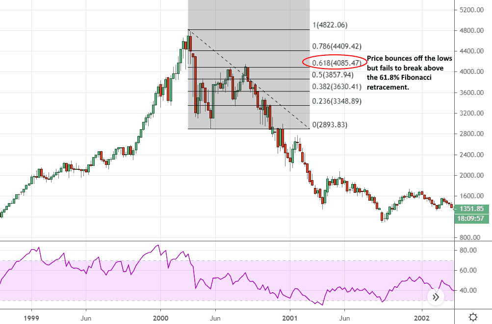 Below you’ll find an image of the Nasdaq 100 at the weekly time frame. It depicts the price action at the height of the dot-com bubble and the crash that followed. As you can see, following the lows it set in May, the market attempted to rebound and was rejected twice from the 50% retracement, and twice from the 61.8% level, only to break down to lower-lows. It would take 14 years for it to cross those levels again.