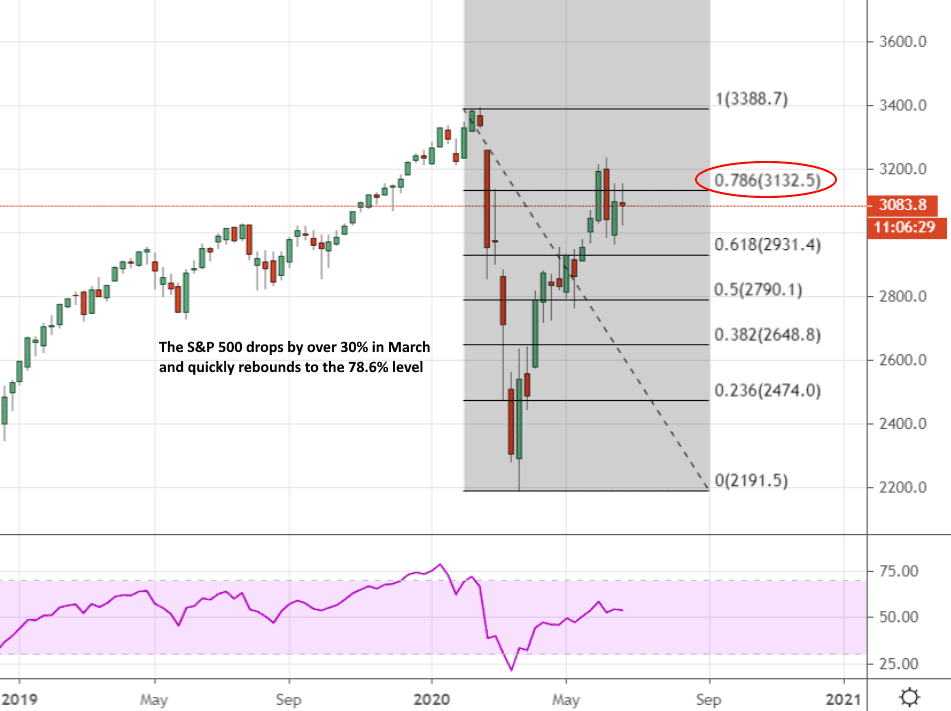 As you can see from the following chart of the S&P 500, there’s quite a difference between the price action we’ve looked at above and the current state of US stock markets. The difference is not due to the magnitudes of the bounces as you may think; it’s the lack of data to go on. This is one of the hardest things to get right when you’re looking at a pattern that’s only just started forming. You try to apply well-known historical patterns to a situation that is only just starting to develop.