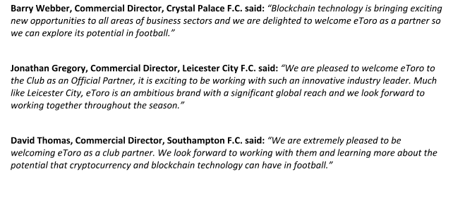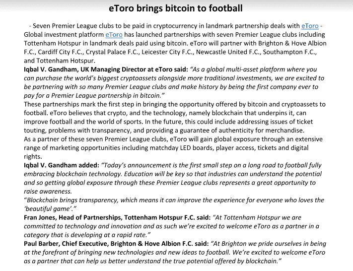 eToro, a top recommended Forex broker that specializes in social trading, has found a way to merge bitcoin with football. The move expands the reach of the popular cryptocurrency and introduces new ways to utilize the blockchain technology upon which bitcoin is based. Read the press release below to see how eToro is revolutionizing the worlds or football and cryptocurrency.
