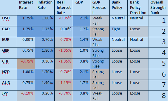 Looking at the economic fundamentals and central bank policies of all the major Forex currencies, we begin the year 2020 with the U.S. and Canadian Dollars as the currencies in the strongest positions, while the Japanese Yen and Australian Dollar are in the weakest positions. Such fundamental situations, once established, tend to persist for some time.