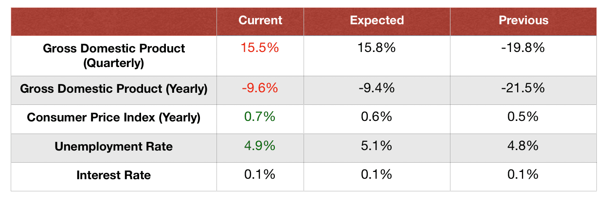 On the other hand, the latest gross domestic product figure missed analysts' expectations, though improved from the previous quarter’s figure. In quarterly terms, the GDP rose by 15.5 percent in the third quarter after falling by 19.8 percent in the previous quarter. In annual terms, the GDP contracted by 9.6 percent, missing expectations of a 9.4 percent contraction and improving from the previously reported 21.5 percent drop.