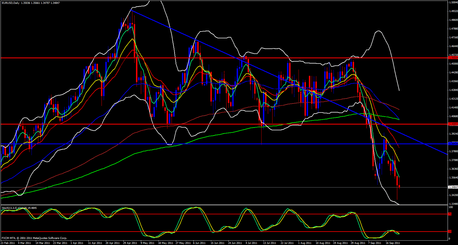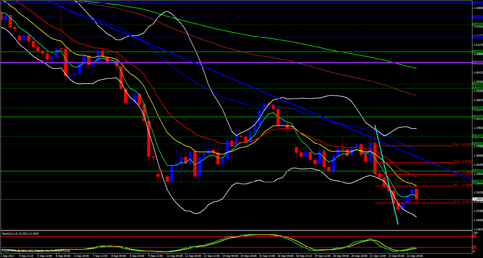Looking at the 15 minute chart the 5 ema has crossed below the 13 ema. Lower Bollinger Band is wide open and pointing down, price has permission to fall. USD/CHF has been very strong helping our EUR/USD fall. Bearish day ahead, beware, end of the week profit taking causes erratic price action.