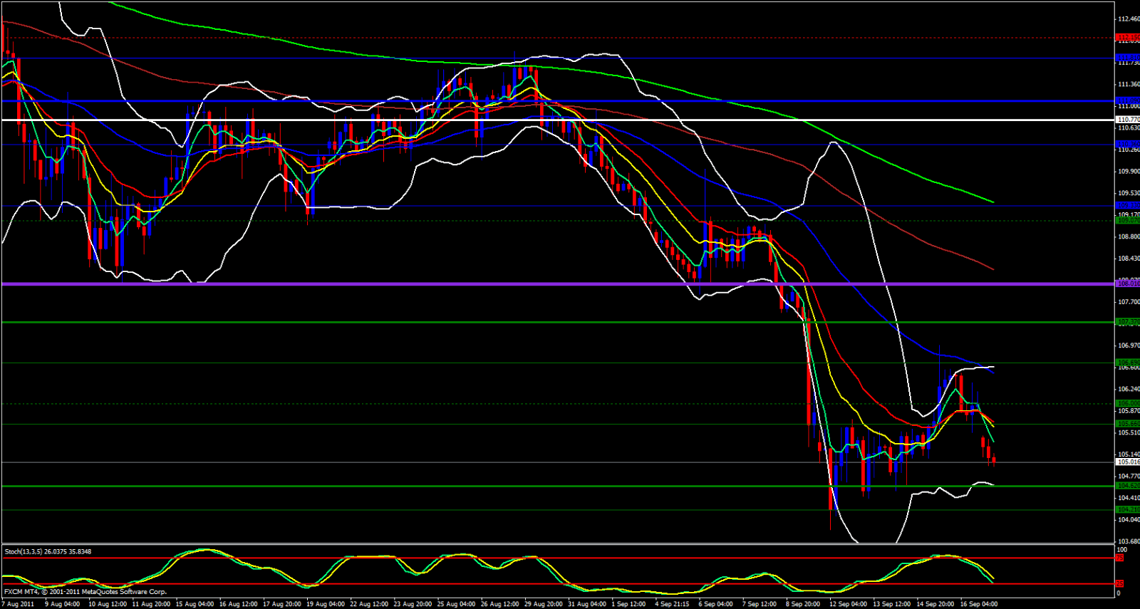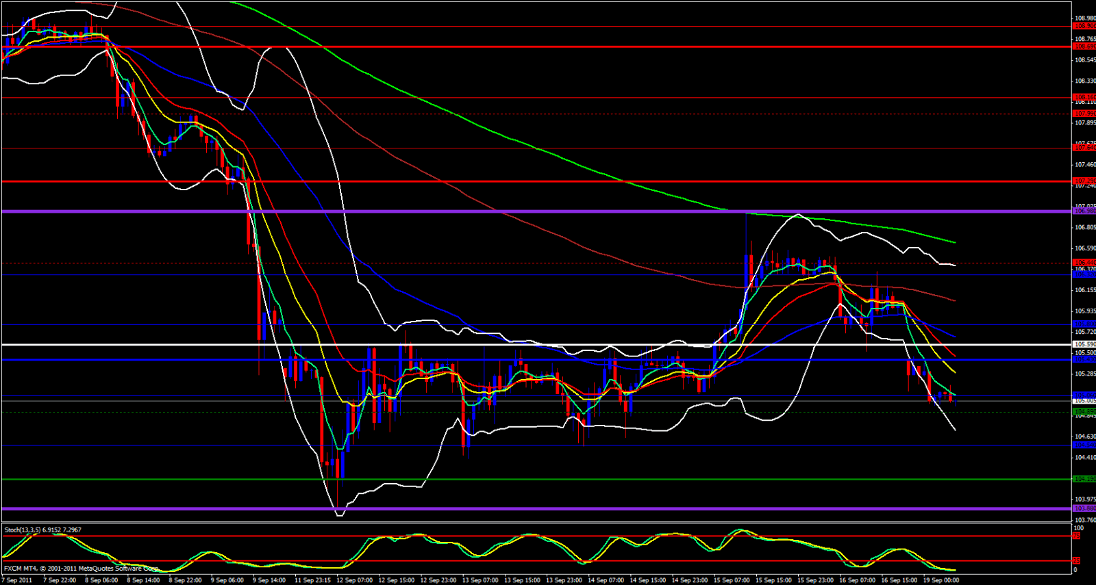 Moving down to the 15 minute chart price just recently came into contact with the 21 ema overlapped with the upper Bollinger Band pointing down adding force to the downtrend. The 15 minute Stochastics is pointing down and price looks very heavy but I cannot ignore that the 15 minute Bollinger Bands are beginning to narrow and price is just above the daily S2 (my daily pivot points tonight are based on Fridays price action). I expect price to continue to drop today to around 104.20 which is the weekly S1 and can go as far down as 103.88 which was the Friday low.
