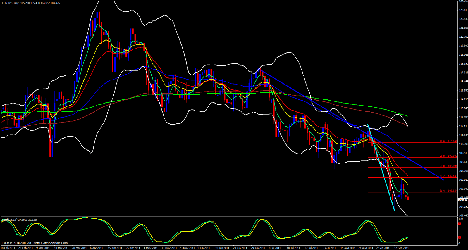 This pair continues to look extremely bearish. On the weekly chart it is coasting down the 5 ema with the 13 ema stepping in each time the 5 is breached. Looking at the daily chart it is very obviousy that price has retraced to the 38.2 Fib which overlaps with the 13 ema making that 38.2 fib very strong resistance. The ema's on both the weekly and daily charts have substantial angle and seperation between each of them which indicated a fast and powerful down trend.