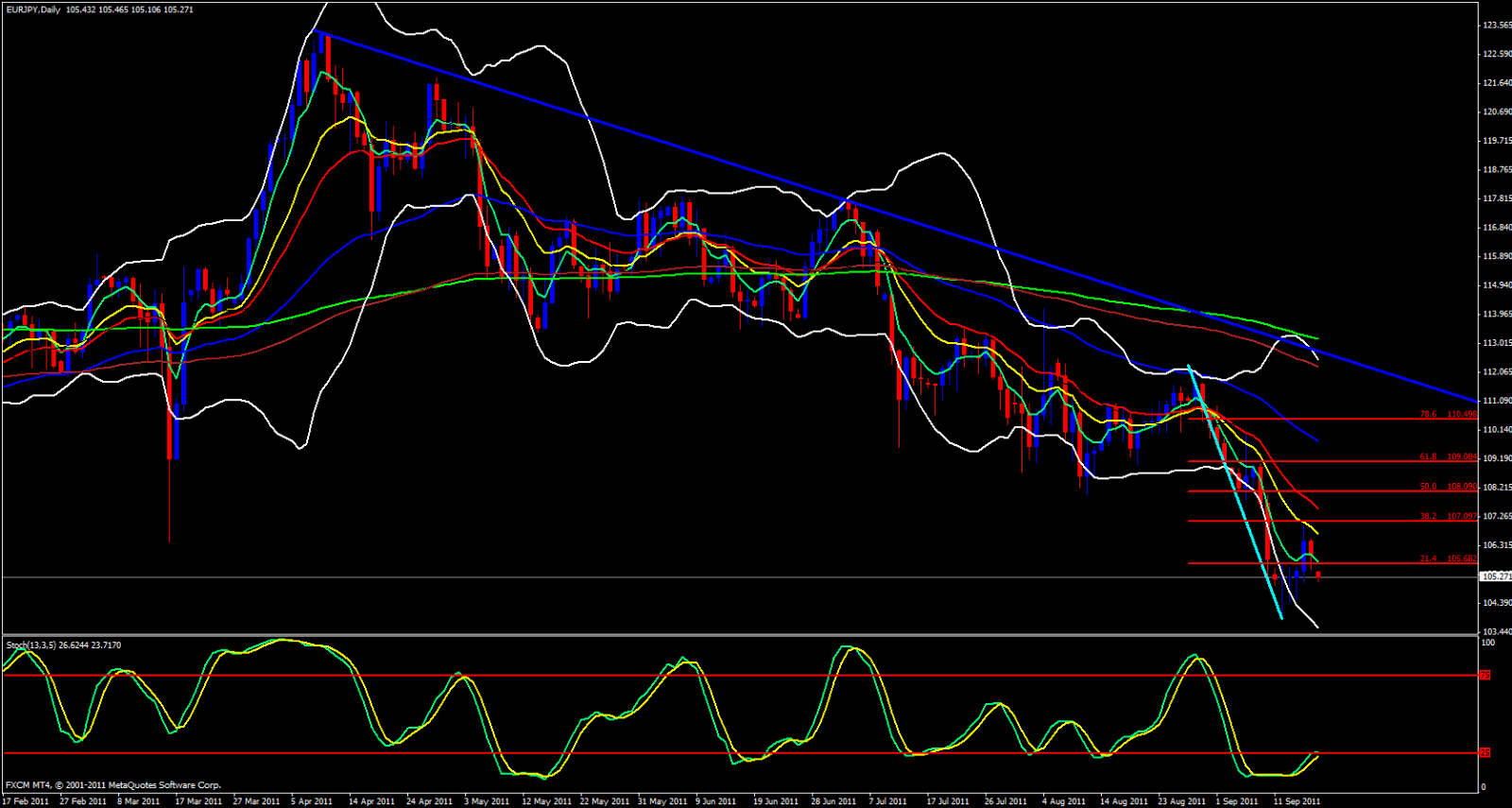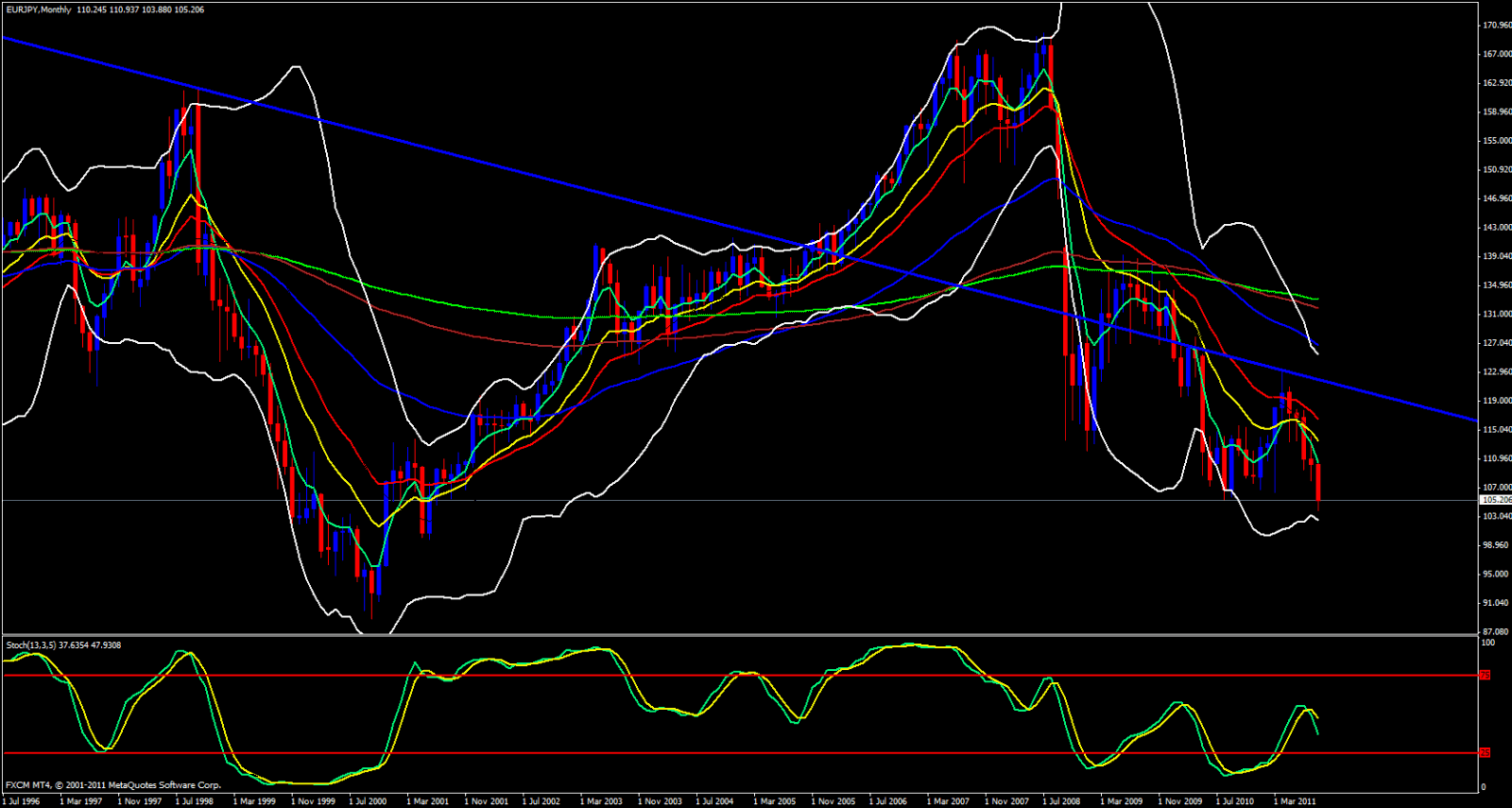 I can see that price could work meet up with the weekly 5 ema which happens to coincide with the daily 13 ema before continuing its journey downward but beyond that I am long term bearish on this pair and I will continue to be until proven otherwise. I would expect price to continue down to the 100.00 area where it will then run into visible support and pullback to most likely the monthly 5 ema then should continue downward until it double bottoms around 90.00