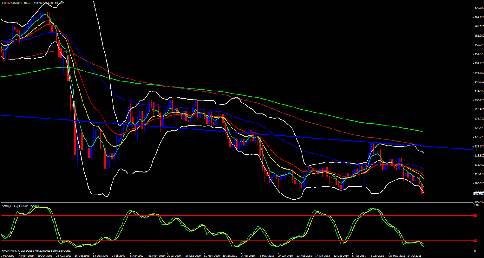 Looking at the weekly chart I see that price has broken previous lows and what could have been depicted as a double bottom. Price is riding down along the 5 ema with the 13 ema standing in when the 5 is pierced.