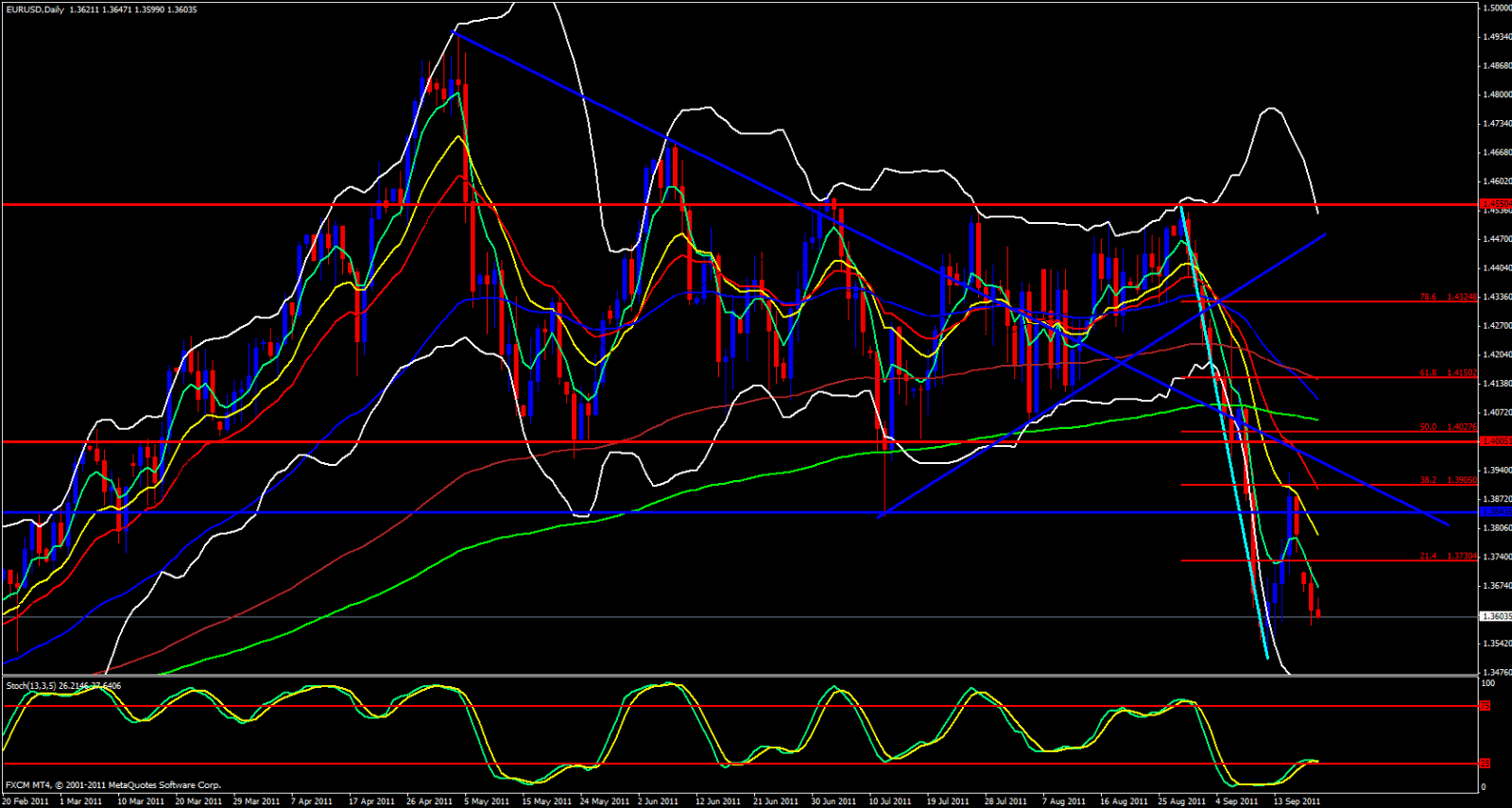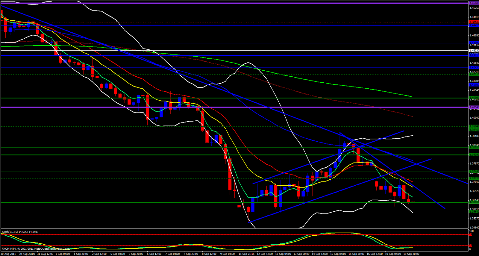 Down to the 1 hour we continue to ride the 5 ema down. We are 60 Pips above the weekly S1. Price has already pierced the daily S1 and the 15 minute 5 ema is pressing down on price. A break below 1.3600 breaks the monthly S3, the daily S1 and breaks a psychological level. Yesterdays low is 1.3585 so expect a rumble in that area. This area will also be seen as a double bottom so be careful. You may get a scalp long off that level as a dead cat bounce (no pun intended). Price will probably come back up to 1.3600 - 1.3615 then look for some red then take another short and aim for 1.3540