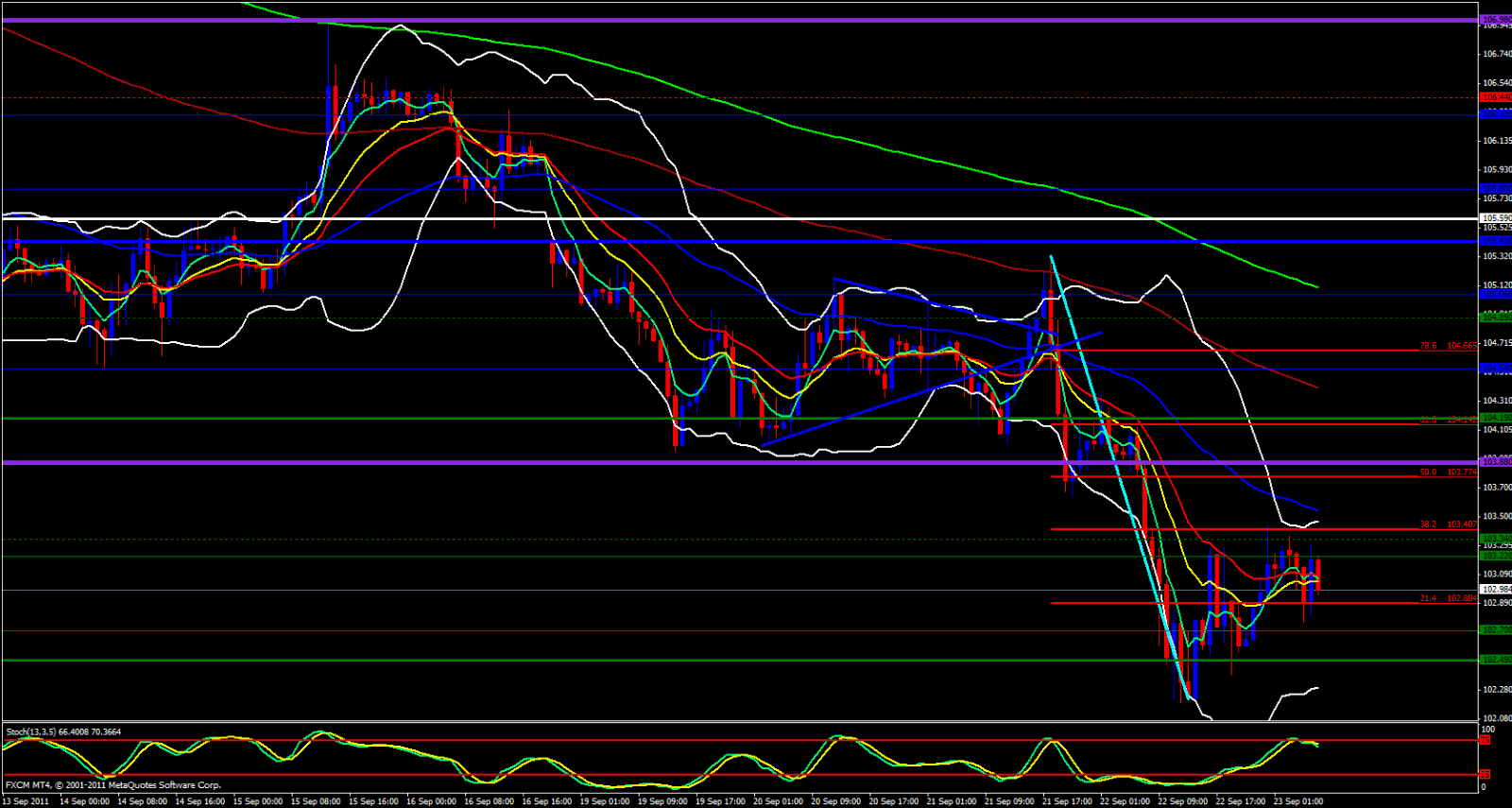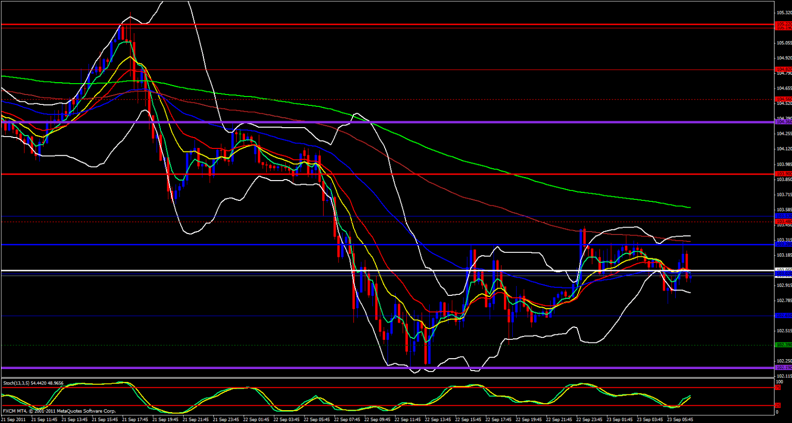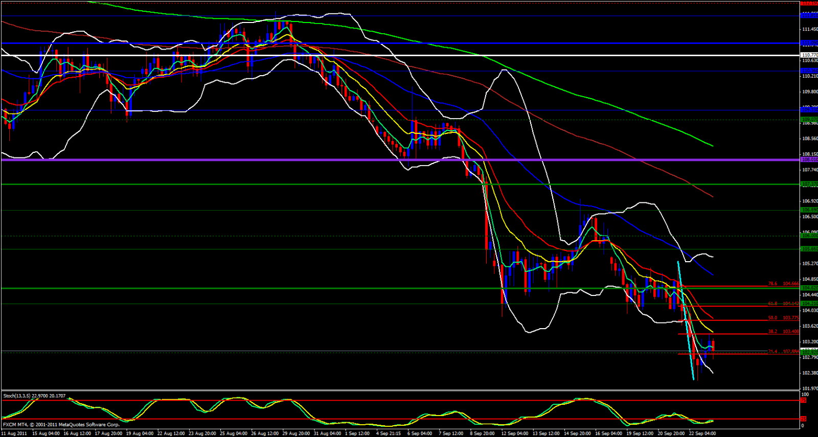On the 15 minute chart price seems to be heading up a bit but the Bollingers are narrow and the stochastic is bullish. I expect price to climb up just a bit and i would expect bearish continuation around the 103.70 - 103.90 levels. As always, it is the end of a bearish week and end of the week profit taking could force price up further than we anticipate.