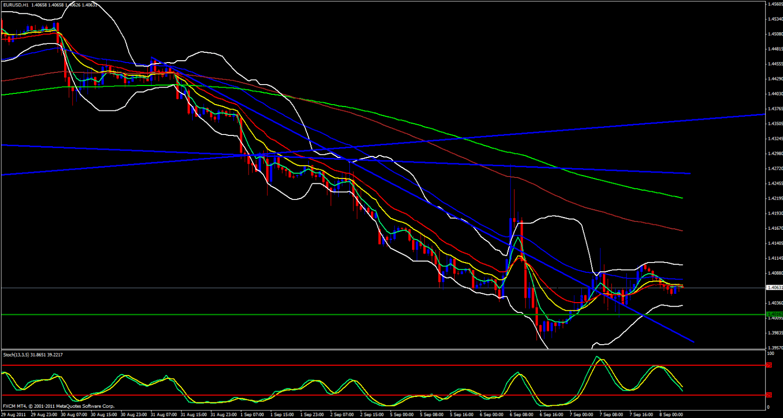 This area appears to be a very tough nut to crack. Taking a quick peak at the weekly we are sitting up against an ascending trend line and bouncing off the lower Bollinger Band. On the 4 hour the 5 ema is just below the 13 ema pointing downward trying to force price downward. Moving along to the 1 Hour chart the 5 ema has crossed through all the 55, 21 and 13 ema's but the upper and lower Bollinger Bands are pointing straight, looks like continued consolidation.