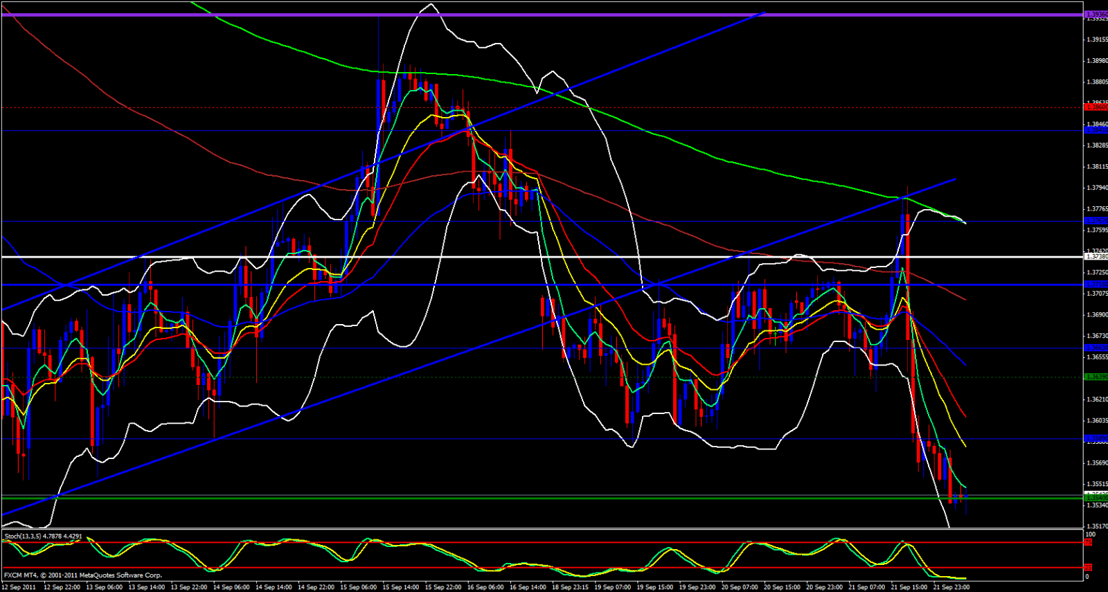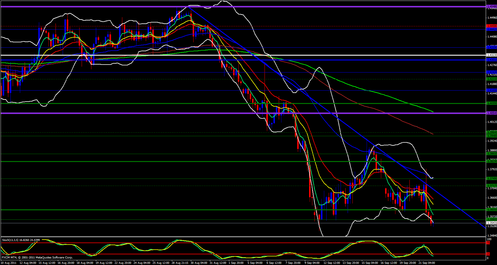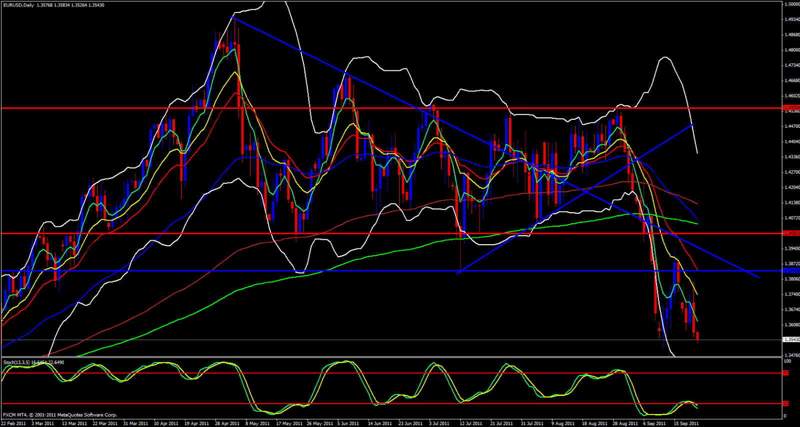 Finally, I look to my 15 minute chart and I see we are beginning to consolidate just a bit. Stochastic is in the oversold zone, price has bounced off the lower Bollinger Band and the 5 and 13 ema's are meeting up with each other. This, does not constitute a pullback just yet, could be just hesitation giving price a chance to catch its breath before further bearish continuation takes place.