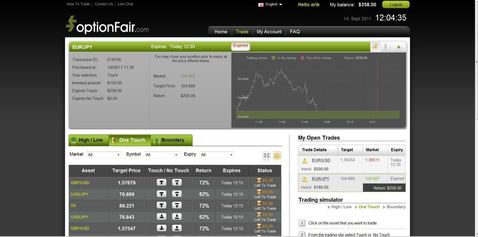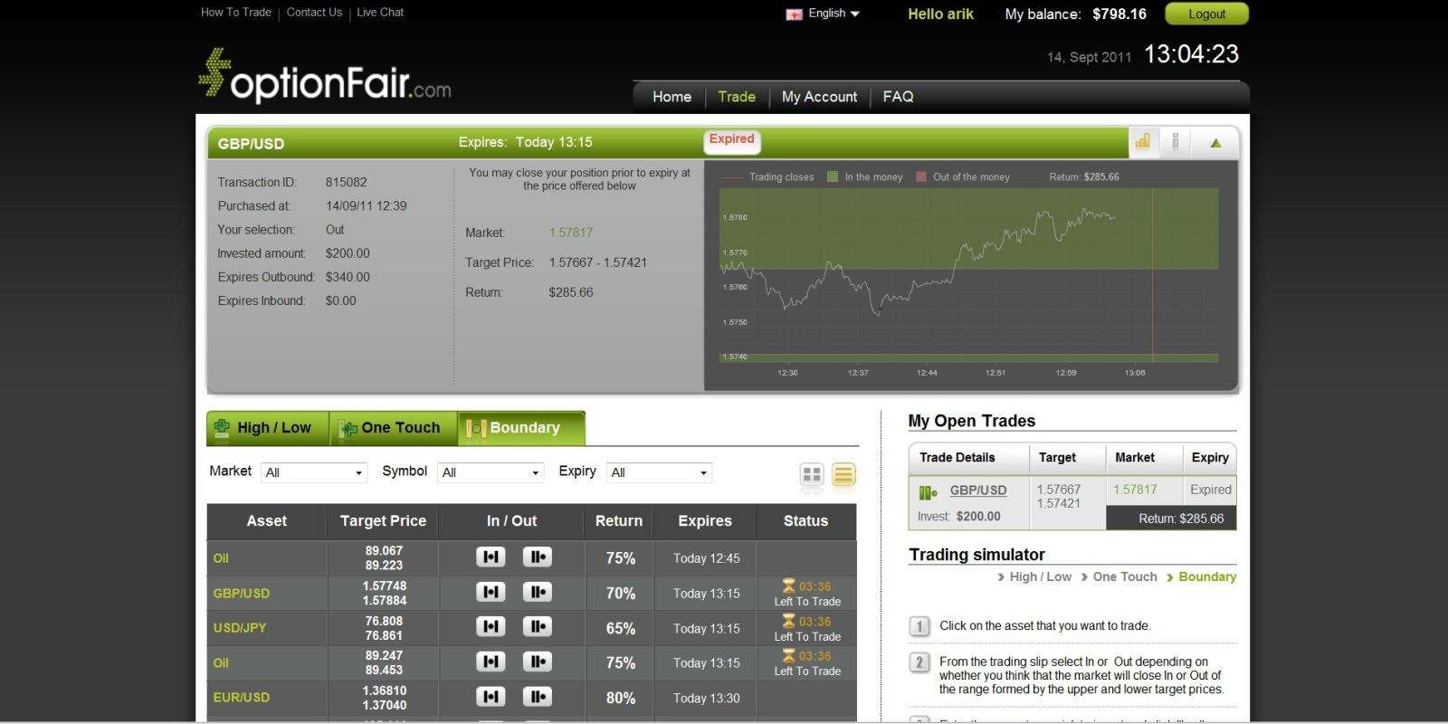Due to a high volatility in the markets, espically in GBP/USD, volatility sensitive instruments such as: “Touch”, “Touch down” and “Out” are suitable for trading. With optionFair™ binary options trading platform, I’ve traded on a $200 on Boundary instrument (choosing out). This kind of option has a return of 70% if the option expires “in the money”, which means I’ll get a return of $144 on my investment. The market price for GBP/USD at the buying time (12:40) was 1.5755 and in order to win the option- the market price should be out of the range 1.5766-1.5742. Although the option was moving on the right direction towards the touch point, I’ve chose to close the option prior to expiry time and collect some of the profits. On this particular case I’ve earned over 40% of my profit in less than 30 minutes.