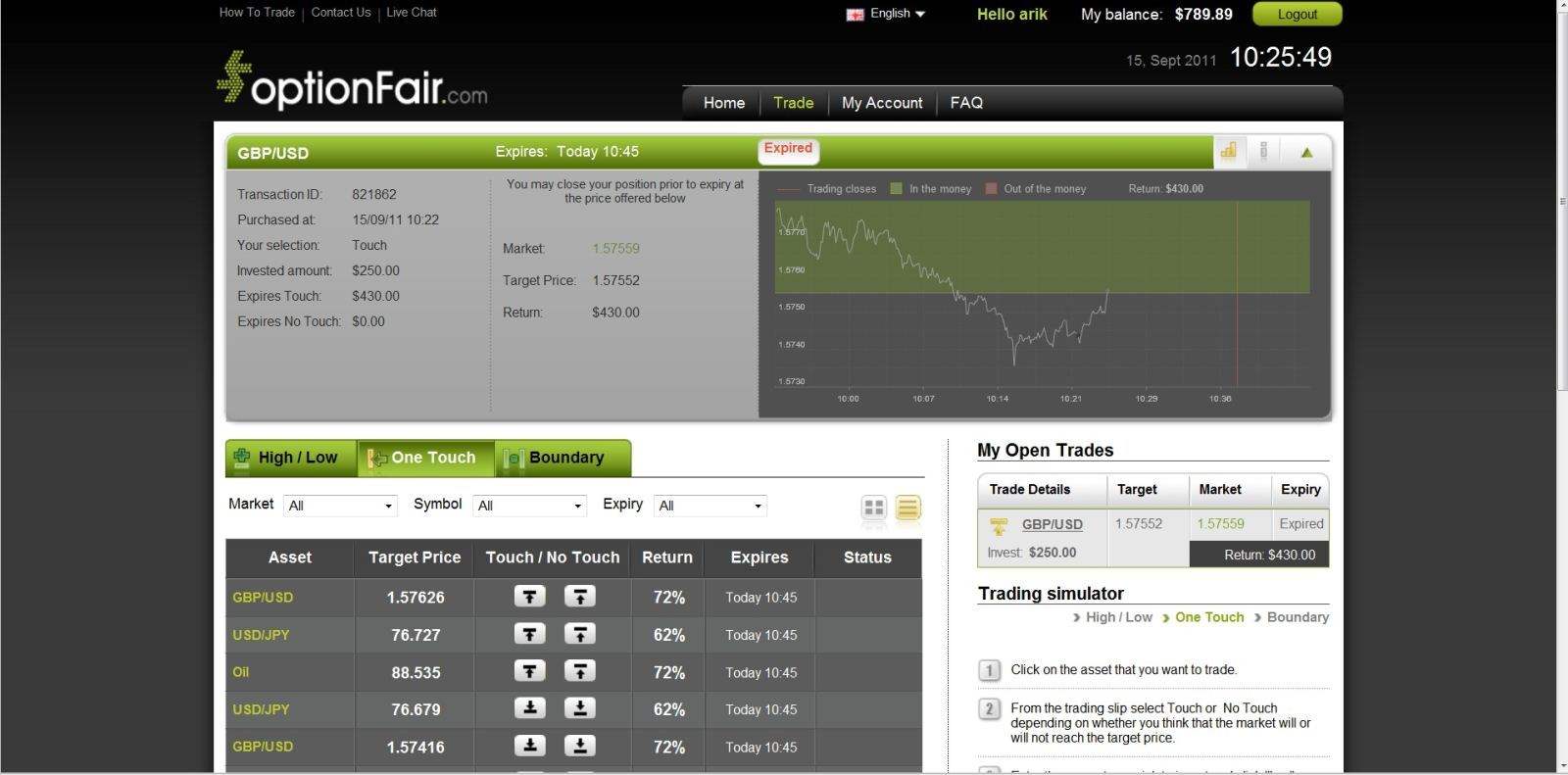 With optionFair™ binary options trading platform, I traded on a $250 on Touch instrument. If the option touches the “target price”, this kind of option has a return of 72%, which means I can earn a return of $180 on my investment. The market price for GBP/USD at the buying time (10:21) was 1.5741 and in order to win the option - the price should touch 1.57552. I took $180 on my $250 investment in 6 minutes!