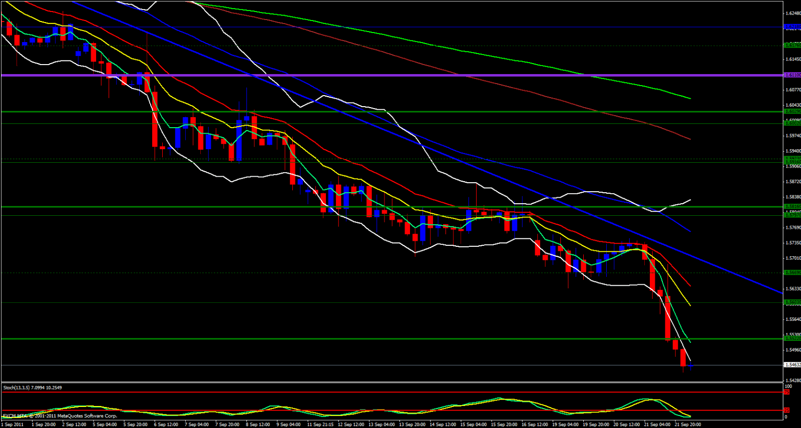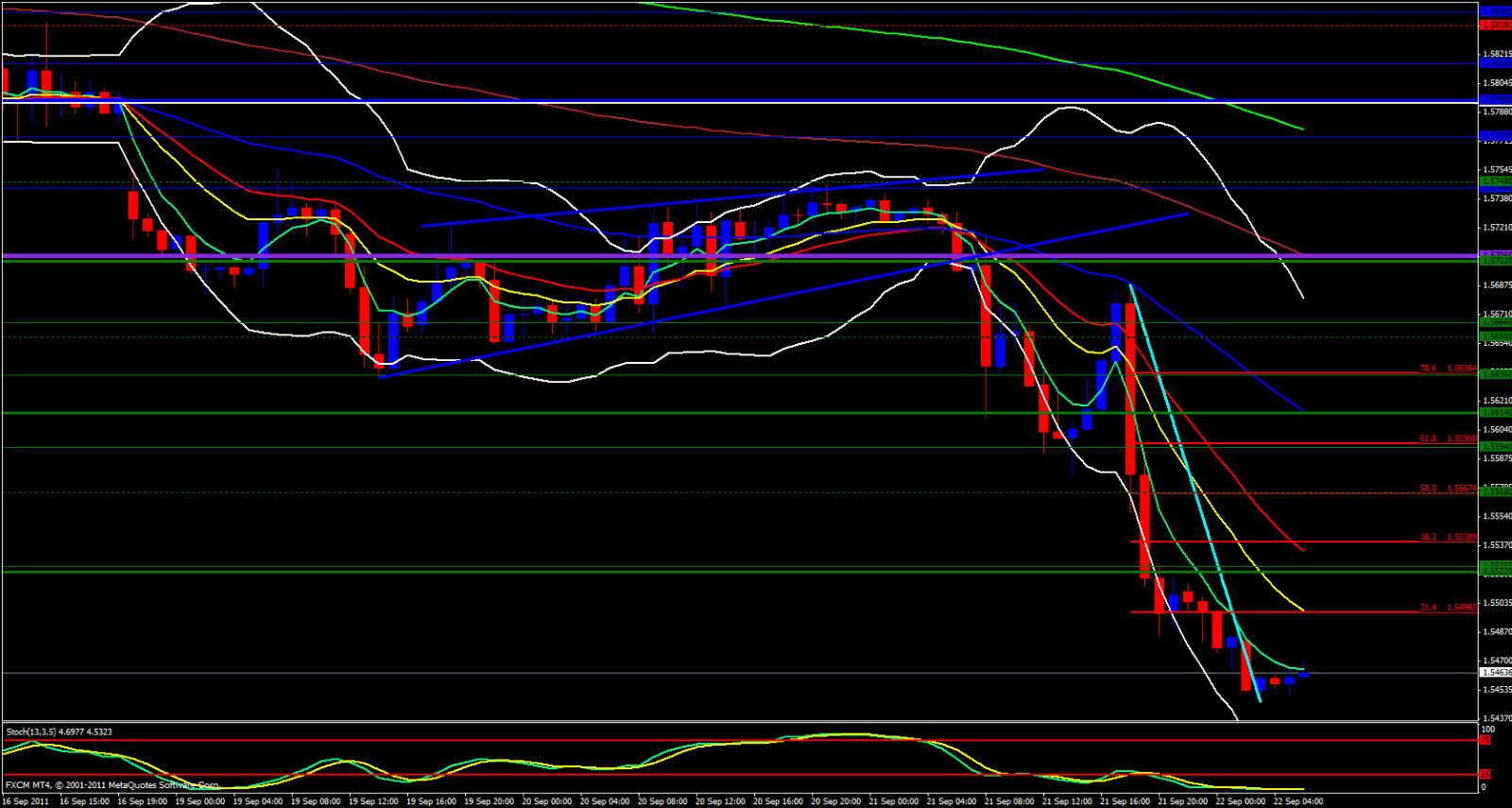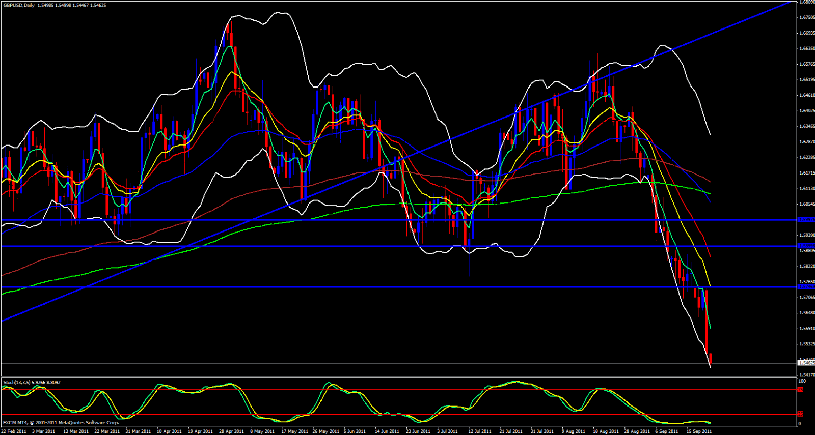 Price has also broken the Weekly S3 Pivot point and is below yesterdays low. If price can make it down to the 1.5400 level I would expect profit taking to kick in causing price to take off to the upside Looking at the 4 hour chart we are below the lower Bollinger Band and the stochastics is oversold.