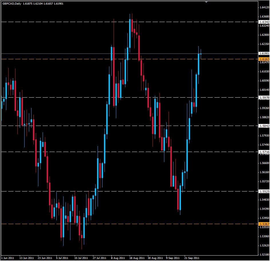 The GBP/CAD Daily Chart appears to be forming a head & shoulders formation, indicating that price could drop soon. We have closed above a monthly support level of 1.6163 and price is indeed falling a few hours into the Asian session. However we had a very strong bullish candle yesterday indicating prices could go higher. If we break above 1.6225 resistance we could be heading for 1.6300 with a daily resistance zone at 1.6342.