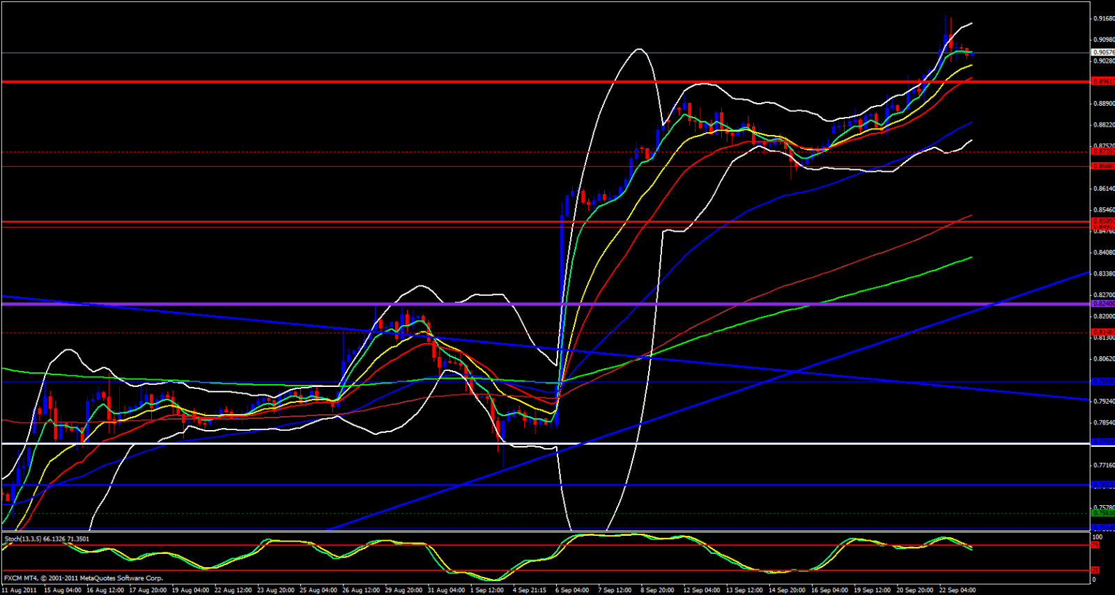 On the weekly chart price has been riding the 5 ema and the upper Bollinger Band is open and pointing up and the 5 ema has crossed above the 21 ema, very bullish in nature, yet Stochastics is in the oversold zone and there is a space between the 5 ema and current price action so a pullback may be presenting itself.