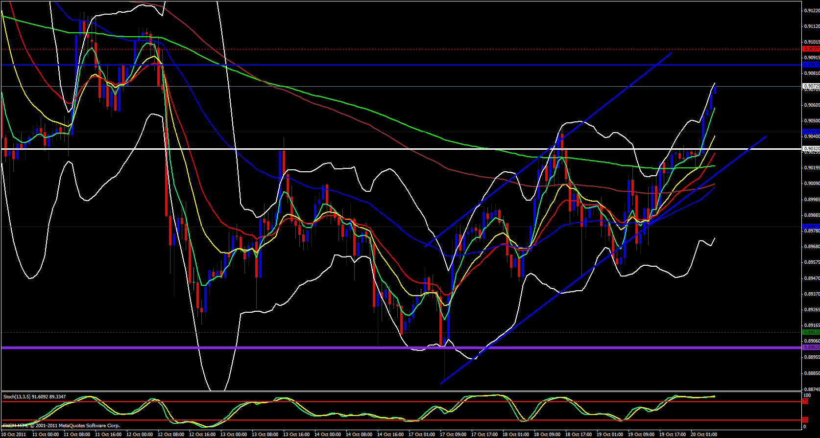 Moving on tot he hourly chart the upper Bollinger band is open and pointing up and price is riding the 5 ema. The weekly M3 is at 0.9097 so it is there I would expect price to stop and retrace back down to the 5 ema giving an opportunity to find an entry.