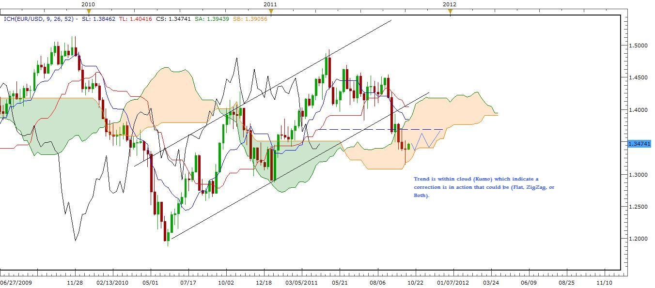Looking at weekly Ichimoku Chart, we can notice that trend has entered the Cloud (Kumo) which tells us that we are going into a correction wave that makes me expect Zigzag, Flat, or combinations before trend leaves the cloud into another major trend either upward or downward. In general trading corrections is very risky so that drives me to zoom the weekly chart to a 4hour chart below to recognize any trading opportunity within Kumo.