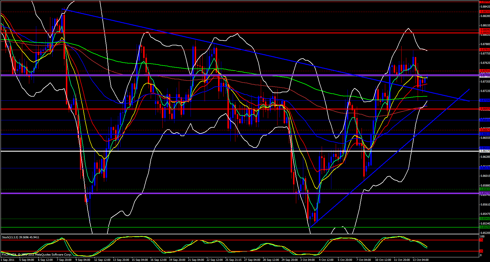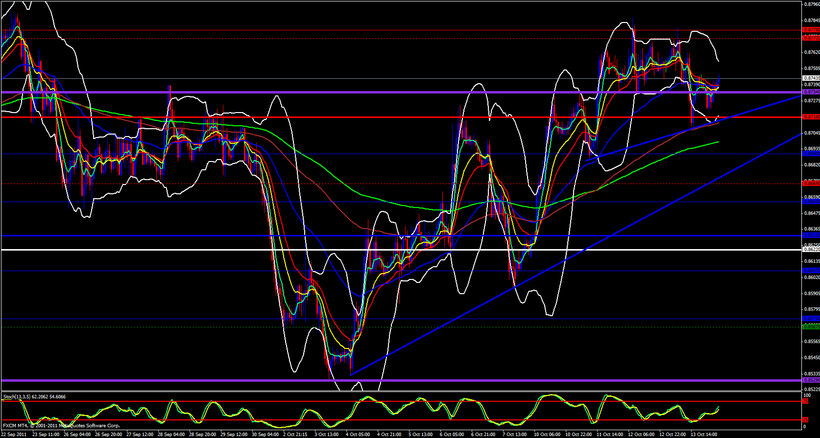 On the hourly we looking bullish since price is above the ema's and the 5 is beginning to rise and could soon be crossing the other ema's. So, based on what I have seen so far, the EUR seems to be the stronger currency.