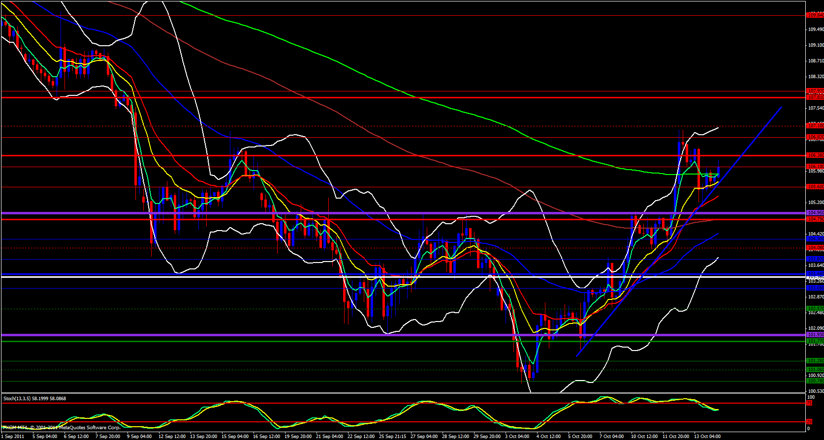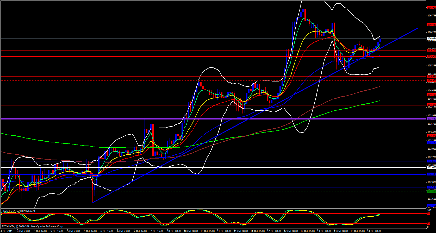 Moving onward tot he hourly chart, the upper Bollinger band is open an pointing up with the 5 ema just below price action. Seems that price is against the daily M3, this may cause some pause but once broken energy will build up and price should take off to the upside witht he next area of resistance around 106.48.