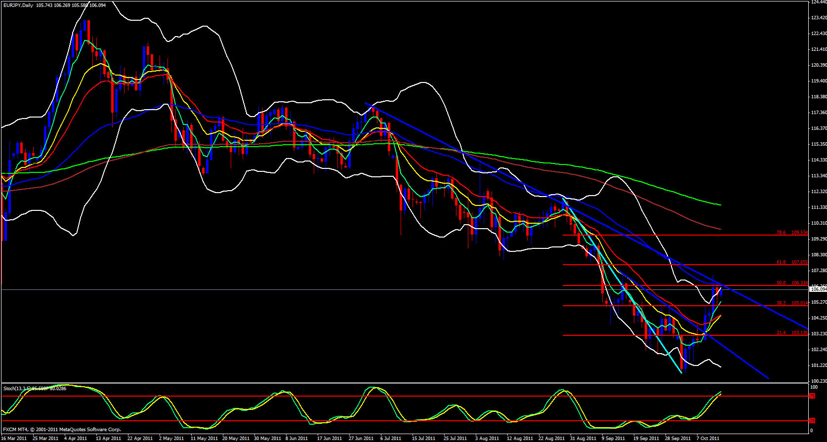 I am going to skip the weekly chart for this pair once again and go straight to the daily. This paid does have bullish energy behind it, but, it is at a 50.0 fib level of the recent move down, up against a 55 ema and a trend line as well as a stochastics in the overbought zone.