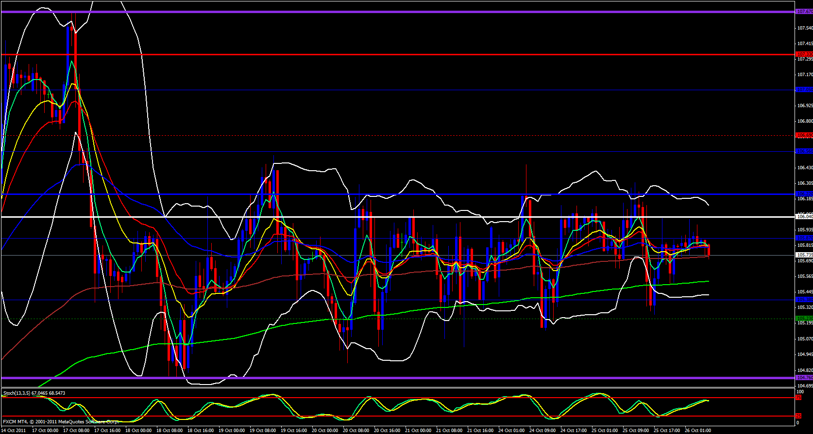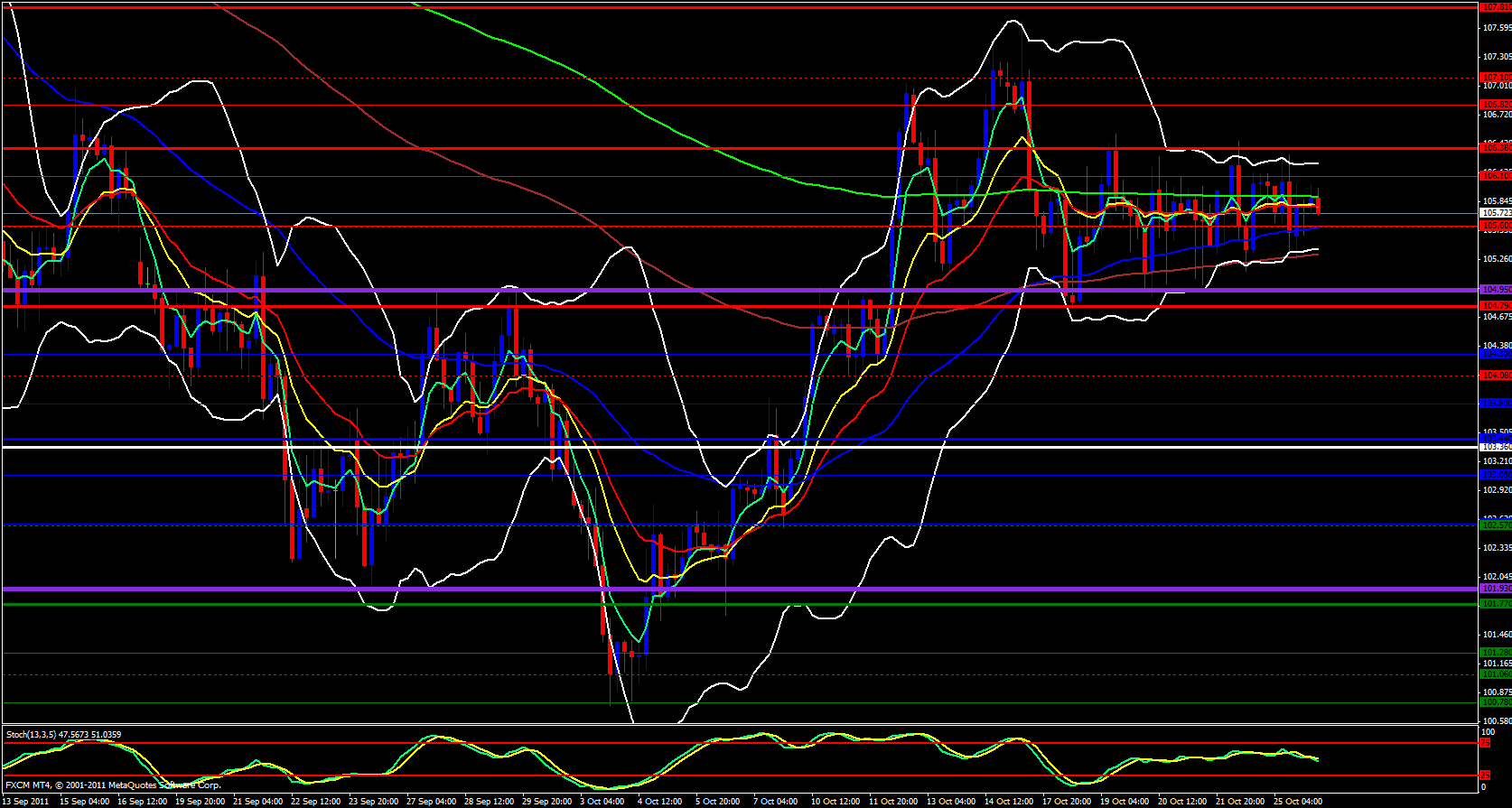 On the hourly chart also my weekly pivot chart price is below the central pivot located at 106.04 and besides that there is no real direction for this pair other than sideways. The ema's are all clumped and braided together, a sign of very little or no volatility.