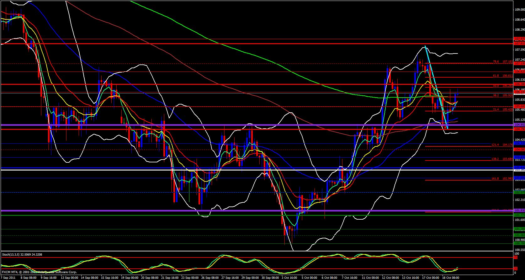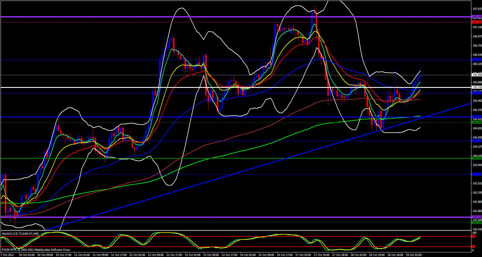 Moving on to the 1 hour chart price still looks incredibly bullish and there is very little or no resistance to really speak about. Price has come up to yesterdays high which just happens to be just a few pips below the R1 Daily Pivot and the stochastic is in the overbought zone. This pair is trending quite well to the upside and I really do not see much reason for this to change other than profit taking. For price to really take off it will need to break above 106.50 but at this time does find itself against some resistance.