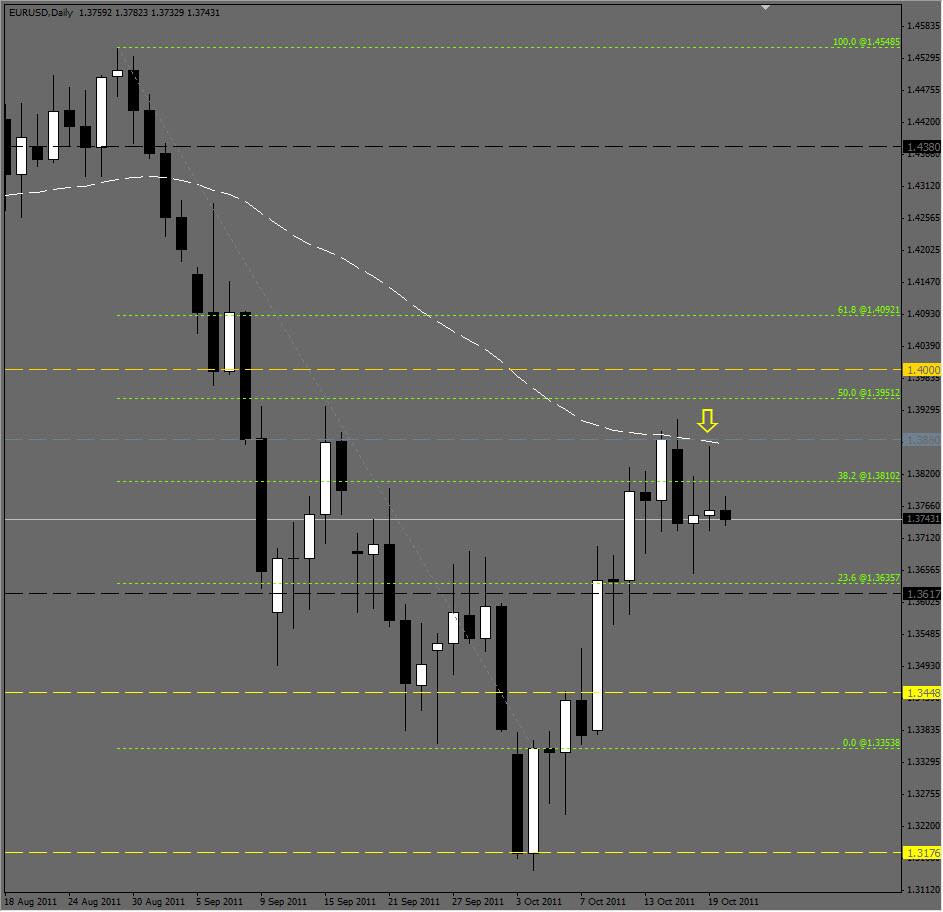 The EUR/USD pair made some bullish movement in yesterdays trading, but could not hold off the bears...for the second day in a row. Although the pair closed higher than it opened and technically speaking had a bullish day, the daily chart is looking very bearish to this trader. Price has not been able to close above the Daily Moving Average, after attempting to do so for 4 days in a row. Placing a Fibo tool on the high of August 29, 2011 and tracing down to the low of October 4th, 2011 we see that price is struggling to close above the 50% retracement level and in fact has retraced more than 38.2%, but not quite 50%, and has also closed below the 38.2% level of 1.38102 4 of the last 5 trading days.