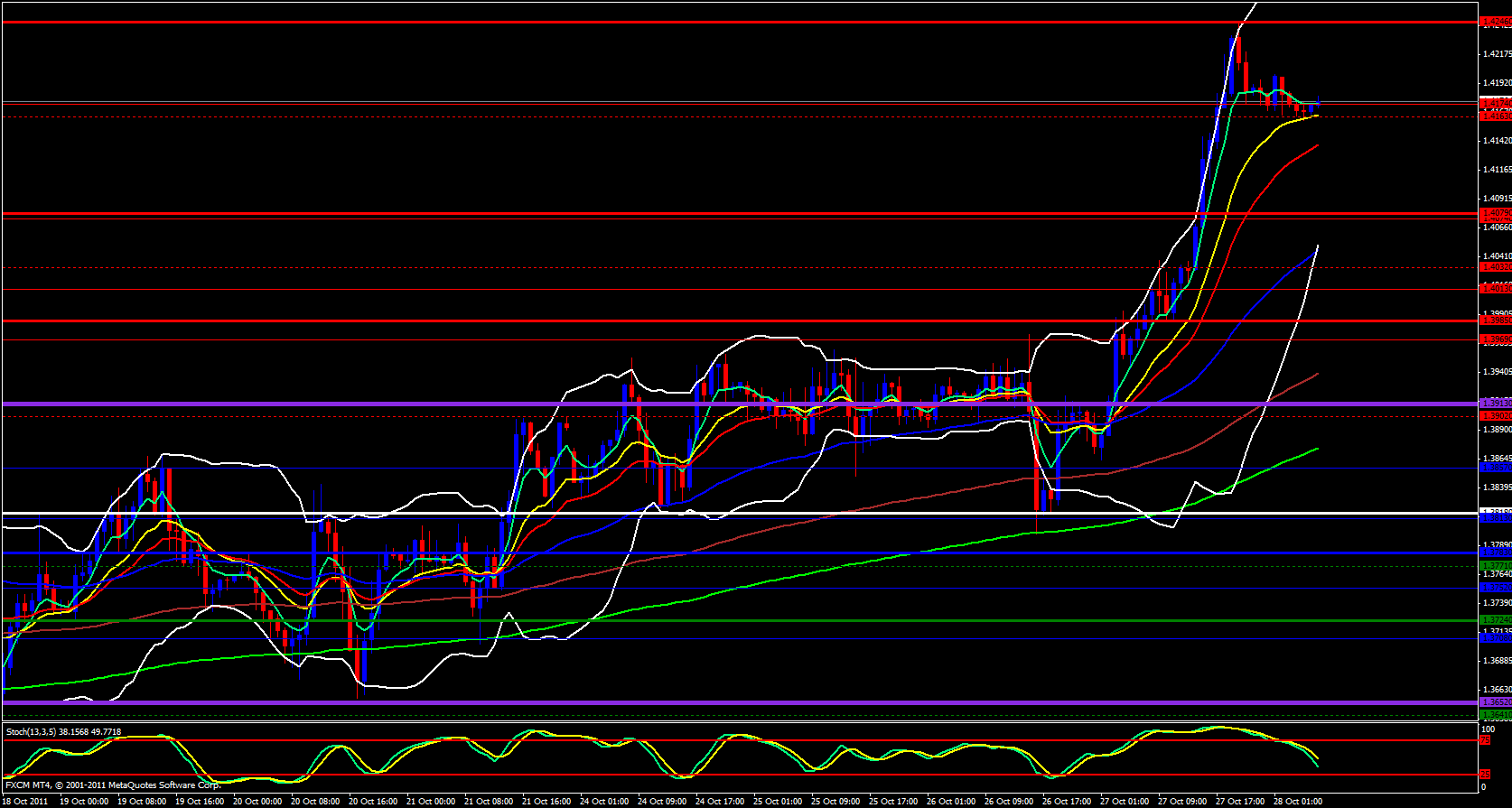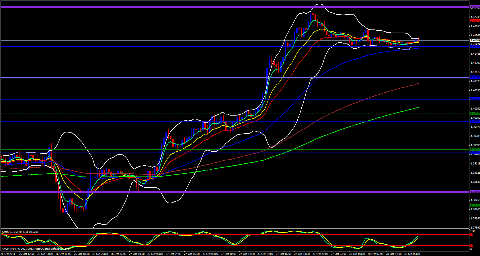 Finally, on the 15 minute daily pivot chart price is in a very narrow Bollinger band in consolidation. The M3 pivot is at 1.4217 and the stochastic is nearing the overbought zone. I expect a not so volatile day today.