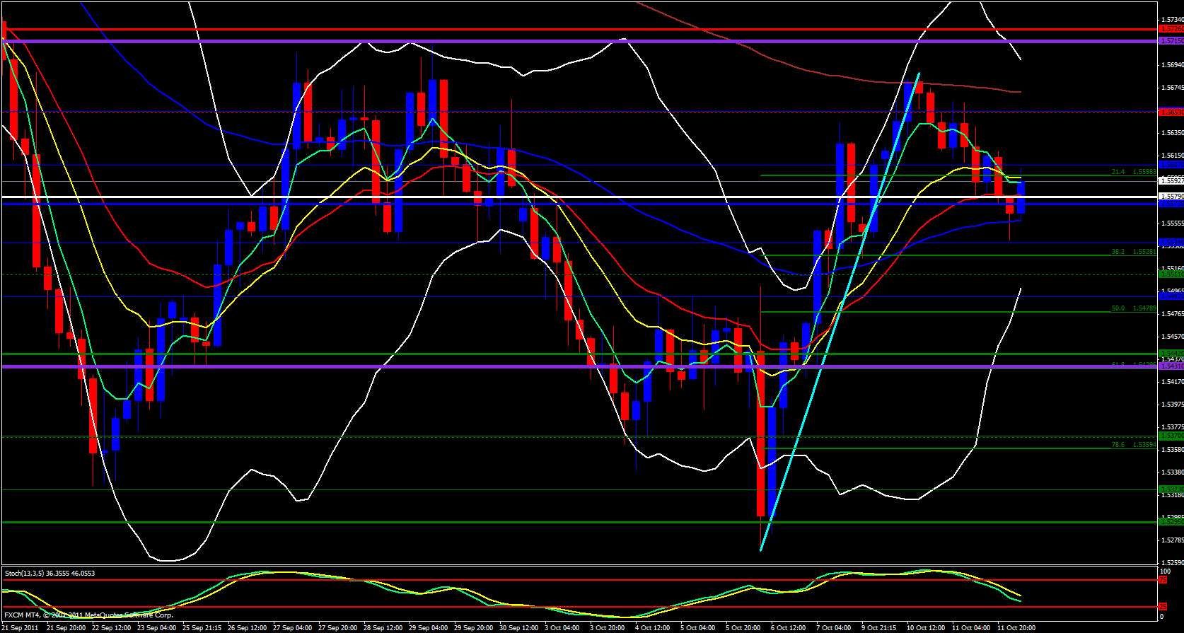I will skip the weekly chart for this pair today and go right to the daily chart. This pair is also looking bullish to me but the GBP is not the strongest currency at the moment. The 5 ema has crossed above the 13 and the stochastics is pointing up, this is all bullish in nature. Looking at the 4 hour chart I see that we have bounced off the 55 ema which sits between the 21.4 and 38.2 fib of the recent move up. This area also overlaps with the hourly 233 and 144 ema and the hourly stochastics is pointing up and in the trade zone and the 5 ema is crossing above the 13. This is all very bullish to me.