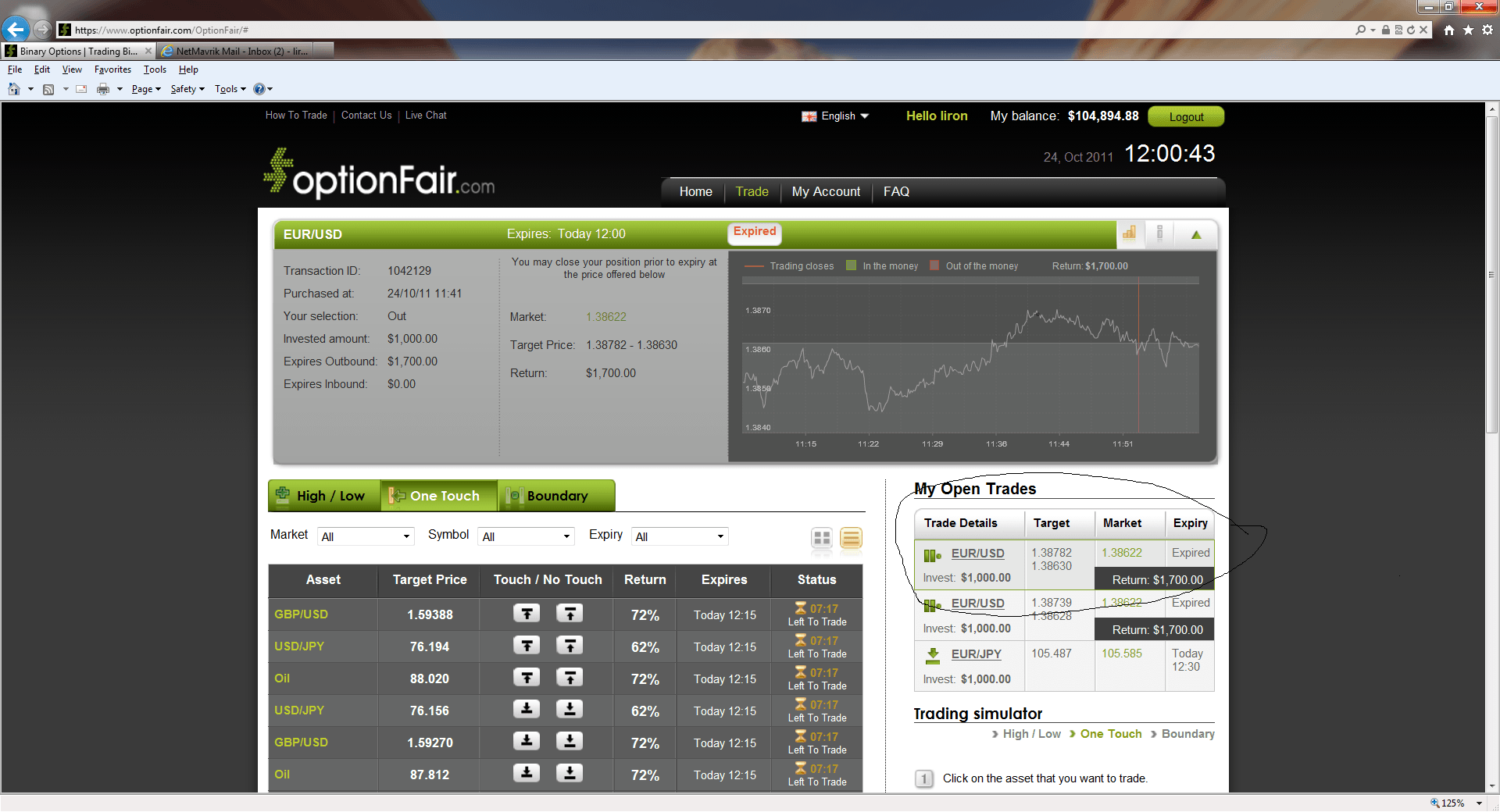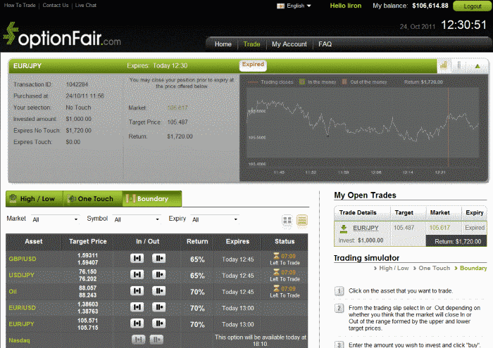 With optionFair™ Binary Options Trading Platform, I traded $1,000 on the “Out” instrument. This kind of option has a return of 70% if the option expires outside the boundary price. I could get a return of $700 on my investment if the signal is correct. The market price for EUR/USD at the buying time (11:41) was 1.38706 and the boundary was 1.38630 – 1.38782. The EUR/USD expiry price was out of the boundary at1.38622. I won the position, earning $700 in 19 minutes!
