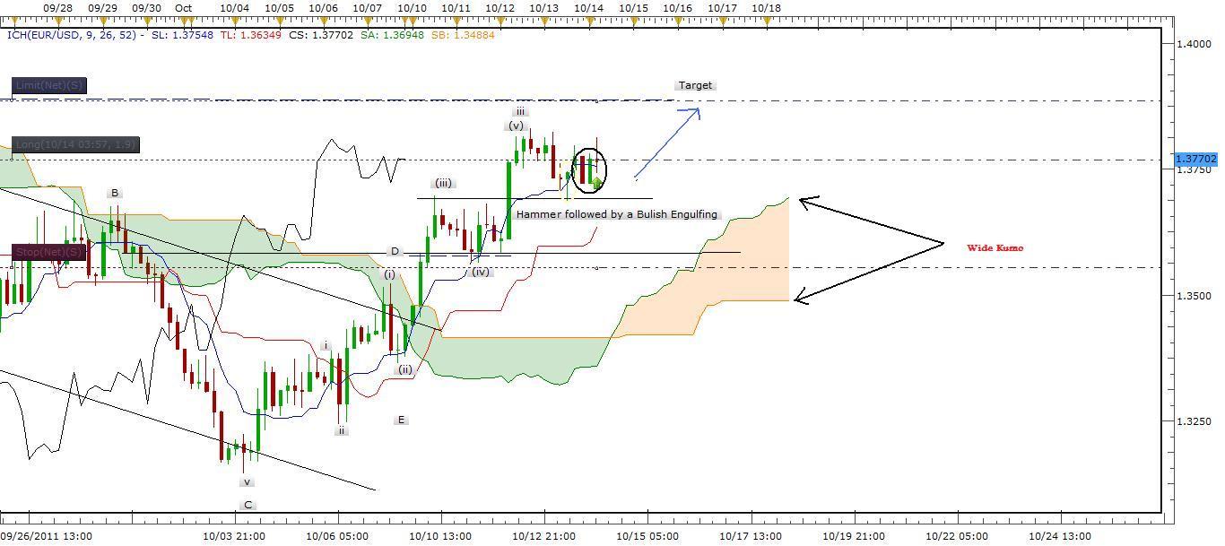 Description: Tenkan sen (Blue Average) is above Kijun sen (Red Average) with a strong Kumo (Wide Cloud) which signal a good upside momentum. A Hummer + A Bullish Engulfing as high lighted indicate a strong support