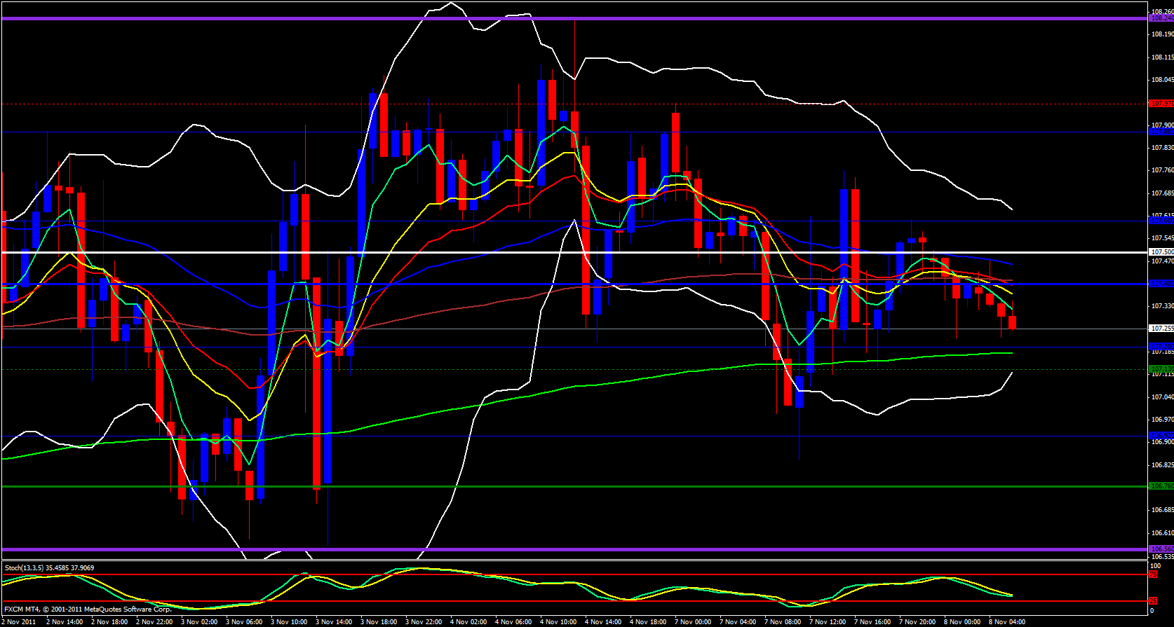 Moving on to the hourly chart price is below the 5 ema and riding it down. The 233 ema exists at 107.18 and the weekly M2 is at 107.13 and is overlapped with the lower Bollinger band which incidentally is closed and pointing up. There is no doubt profit taking and buy action will occur within that price zone between 107.20 and 106.90. Taking a look at the daily pivot points in this zone the daily M2 is at 107.17 and the daily S1 is at 106.86, just two pips above yesterdays low.