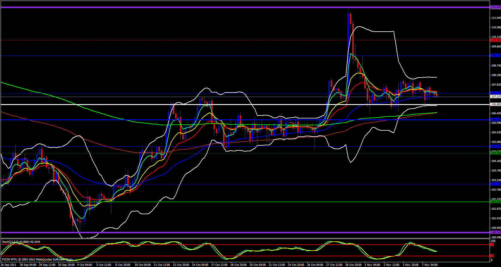 Moving on to the 4 hour chart we are beginning to have a 5 ema cross below the 13 ema, however, the 55 ema is just below price. The 55 has been wicked but it has not been breached. If breached I expect price to continue down to 106.88 which is the monthly central pivot point which is overlapped with the lower Bollinger band. Momentum and speed will have to increase for price to break this level, otherwise, this will be a good level for buyers to enter.