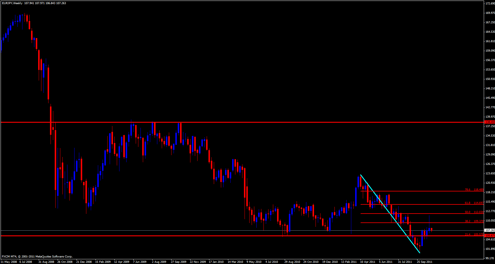 The EUR/JPY has recently made a 50.0 fib to the down side overlapped with a 55 ema on the weekly time frame and at this time the weekly candle is just below the 21 ema.
