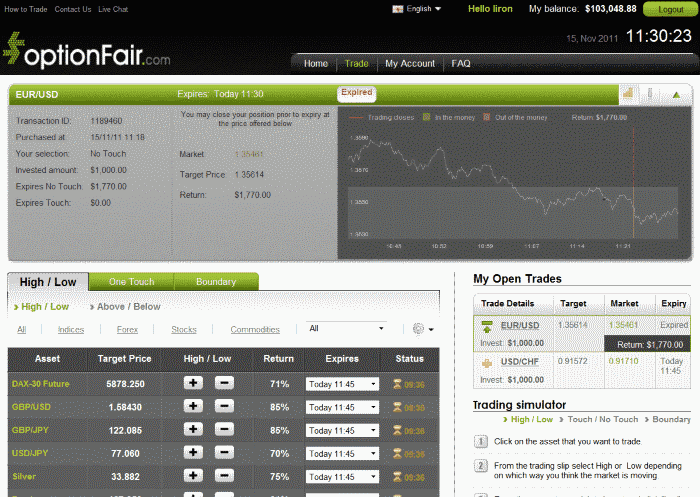 With optionFair™ binary options trading platform, I traded $1,000 on the “No Touch” instrument. This kind of option has a return of 77% if the option expires without touching the strike price, which means that if the signal is correct, I could get a return of $770 on my investment. The market price for EUR/USD at the buying time (11:18) was 1.35542 for the expiration of 11:30 and the strike price was 1.35614. The EUR/USD did not touch the strike price until the expiry, and I won the position, earning $770 in 12 minutes!