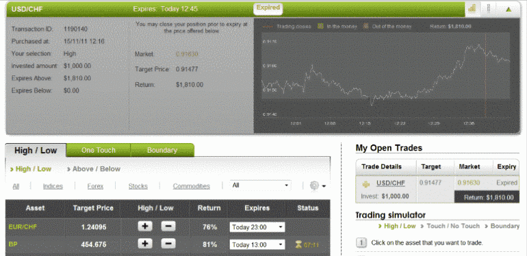 With optionFair™ binary options trading platform, I traded $1,000 on the “High” instrument. This kind of option has a return of 81% if the option expires above the strike price, which means that if the signal is correct, I could get a return of $810 on my investment. The price of the USD/CHF at the buying time (12:16) was 0.91477 for the expiration of 12:45.The option expiration price was 0.91630, above the strike price, so I won $810.