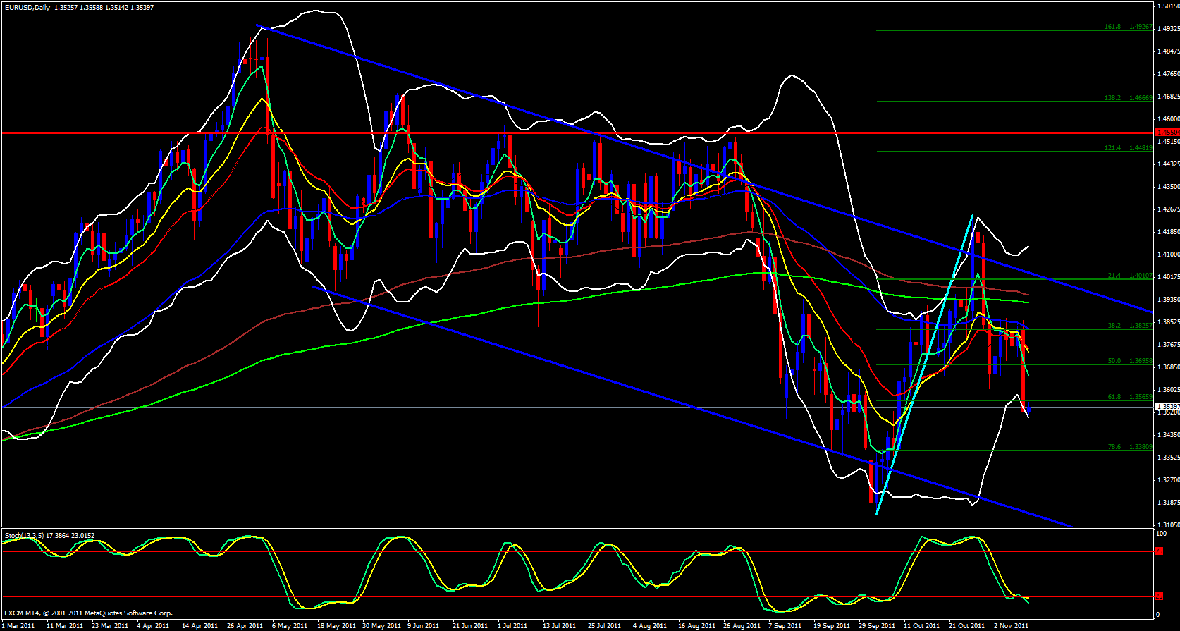 On the daily timeframe price maintains its bearish appearance, the lower Bollinger band is wide open and pointing down and the 5 ema has crossed below the other ema's and is following price down as well.