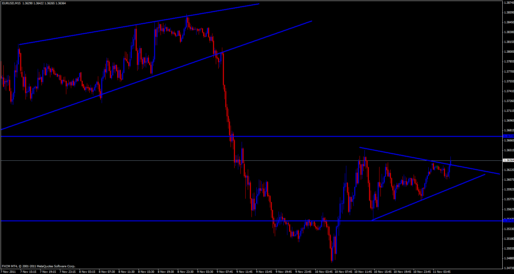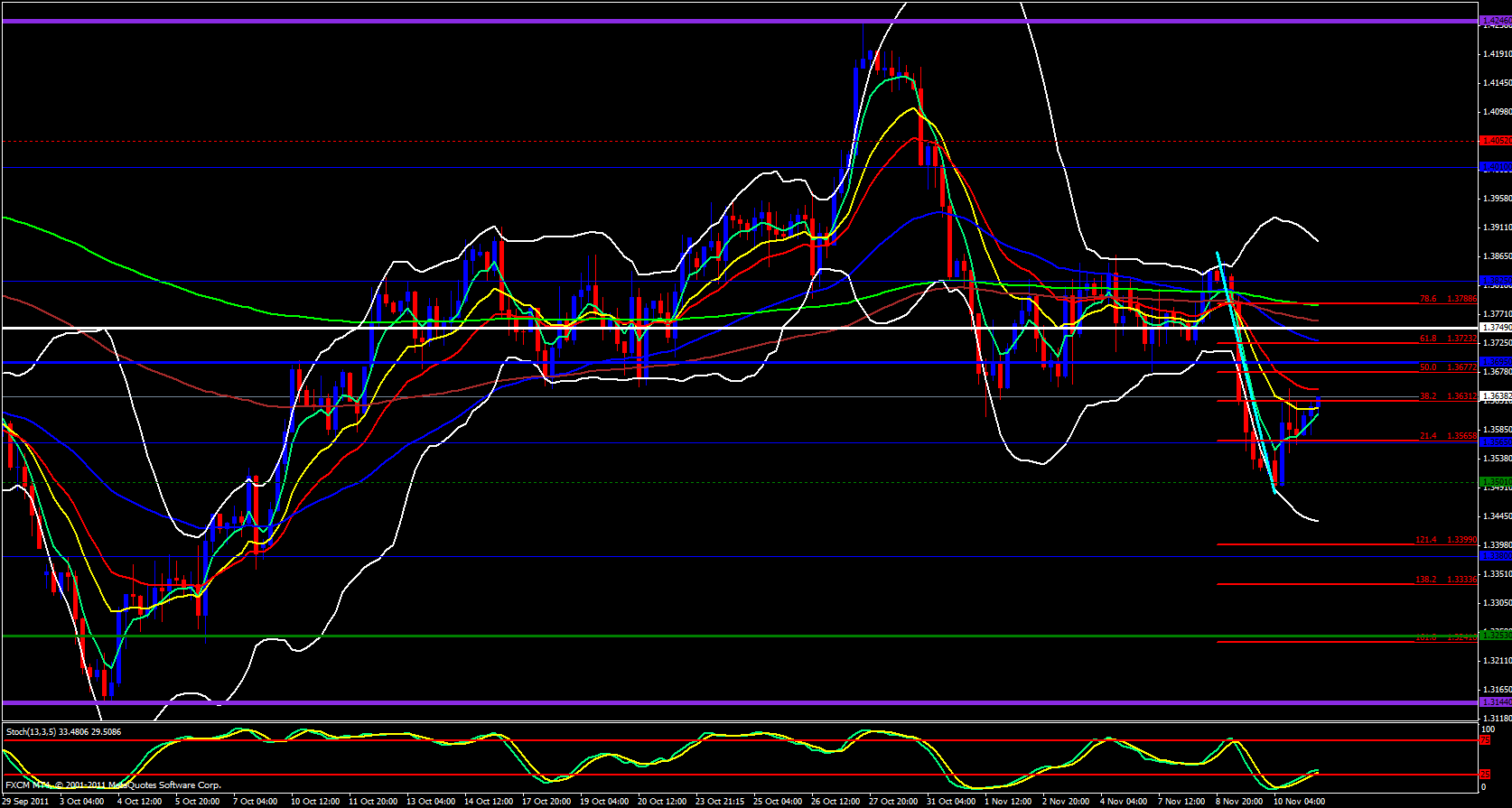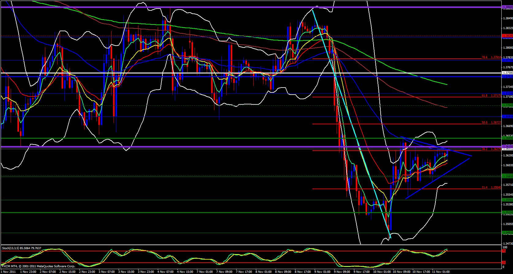 Finally on the 15 minute timeframe at the very nose of the price trap soon price will have to pop. The ema's are bunched together but price is bouncing off the 144 ema to the upside and stochastic looks like it is ready to recycle itself to the upside. The daily M3 is just above price at 1.3629 and last week's low is at 1.3635 .