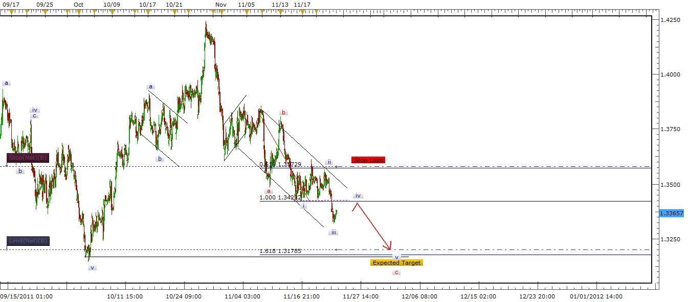 Description: ABC wave in progress as shown. Wave position after it broke 1.3420 level is at end of iii. We will see a simple correction below 1.3420 before it resume falling toward wave v at 1.3200 zone.