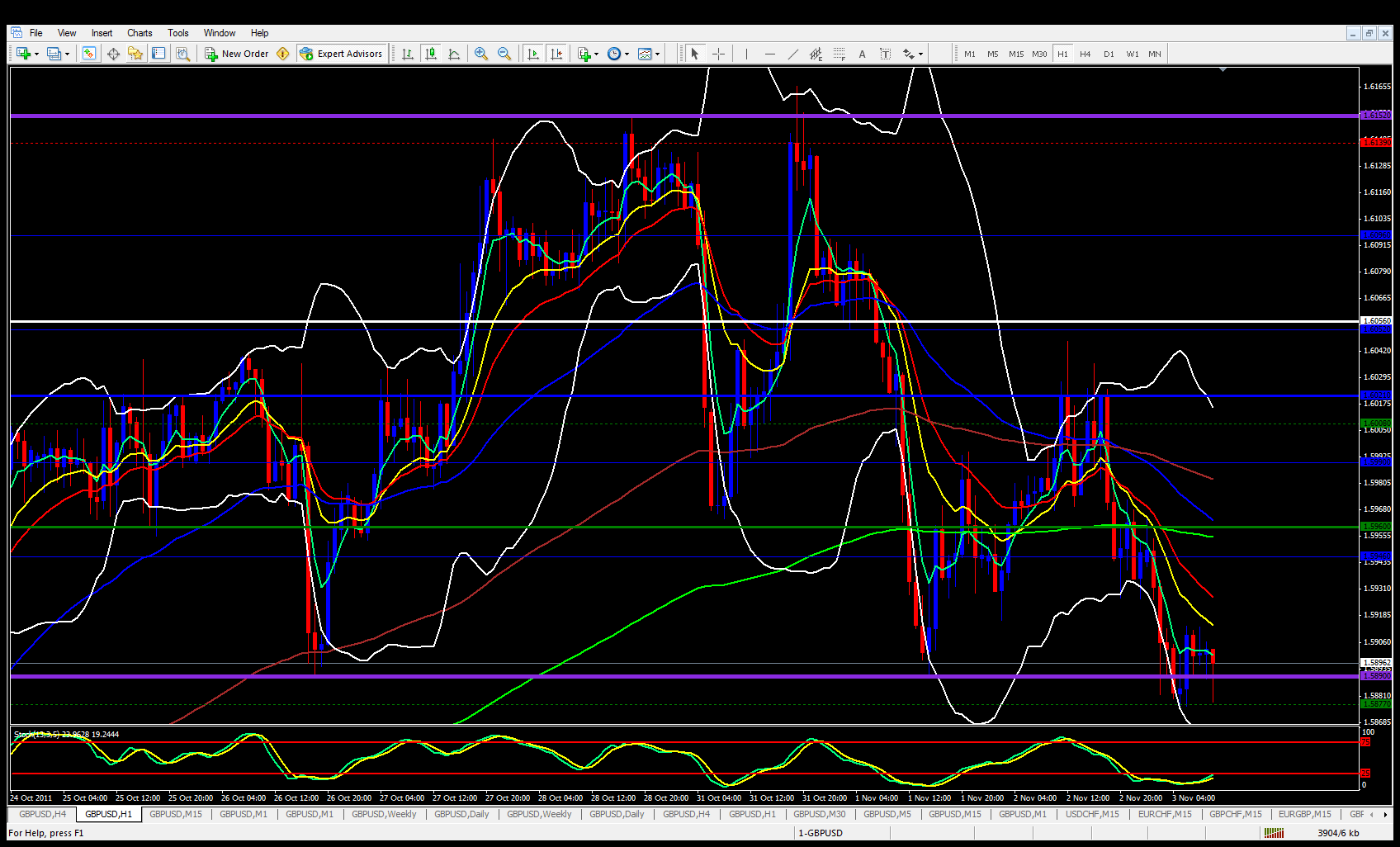 Moving onto the hourly weekly pivot chart price has bounced off the M1 pivot at 1.5877 and has made contact with the 5 ema which seems to be forcing price back down.