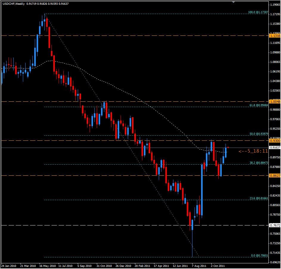 The USD/CHF, or Swissy as it is commonly known to traders, appears to have its sights set on the weekly Support/Resistance Level at 0.9300. The pair tested this level at the beginning of October reaching a high of 0.9314 that week. Now we could be setting up another effort to push through this level, and take the pair higher...or we could be looking at a 'Double Top' formation and follow through with a Bearish move. Drawing Fibonacci Retracement levels from the high at the end of May 2010, to the low in August of this year we see that the weekly zone at 0.9300 is very close to the 50% Fibo level of 0.9397 which will also act as Resistance and could stop the Bulls in their tracks. Below we have the 38.2% retracement at 0.8847 which will provide some support with another weekly S/R Zone offering further support at 0.8627. I will be watching this pair very closely this week. I am cautiously Bullish on this pair for now, but anticipate a potential trend change at this 0.9300 level.
