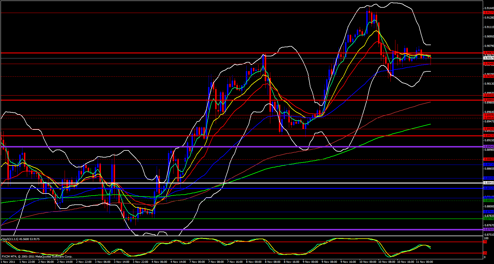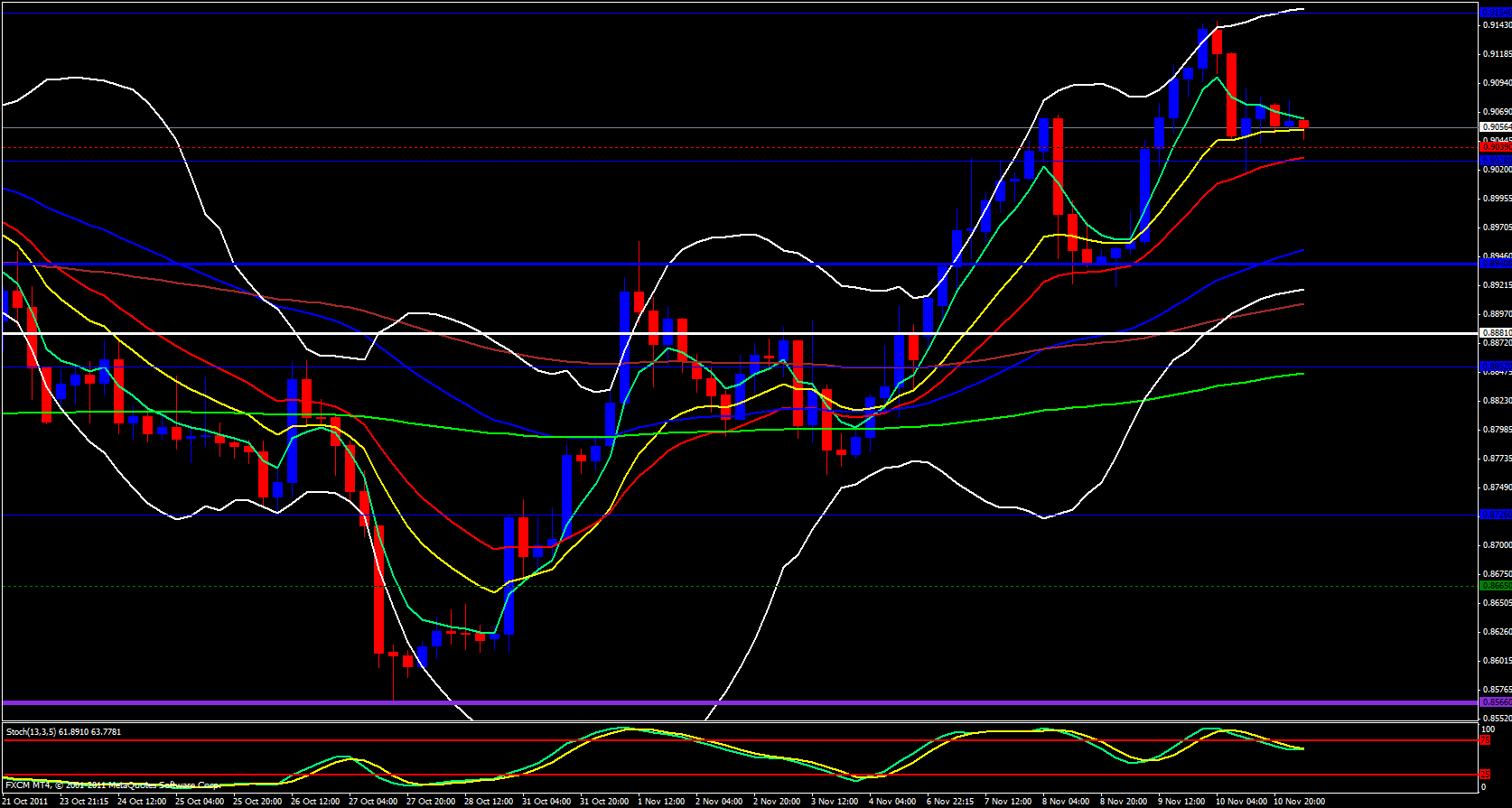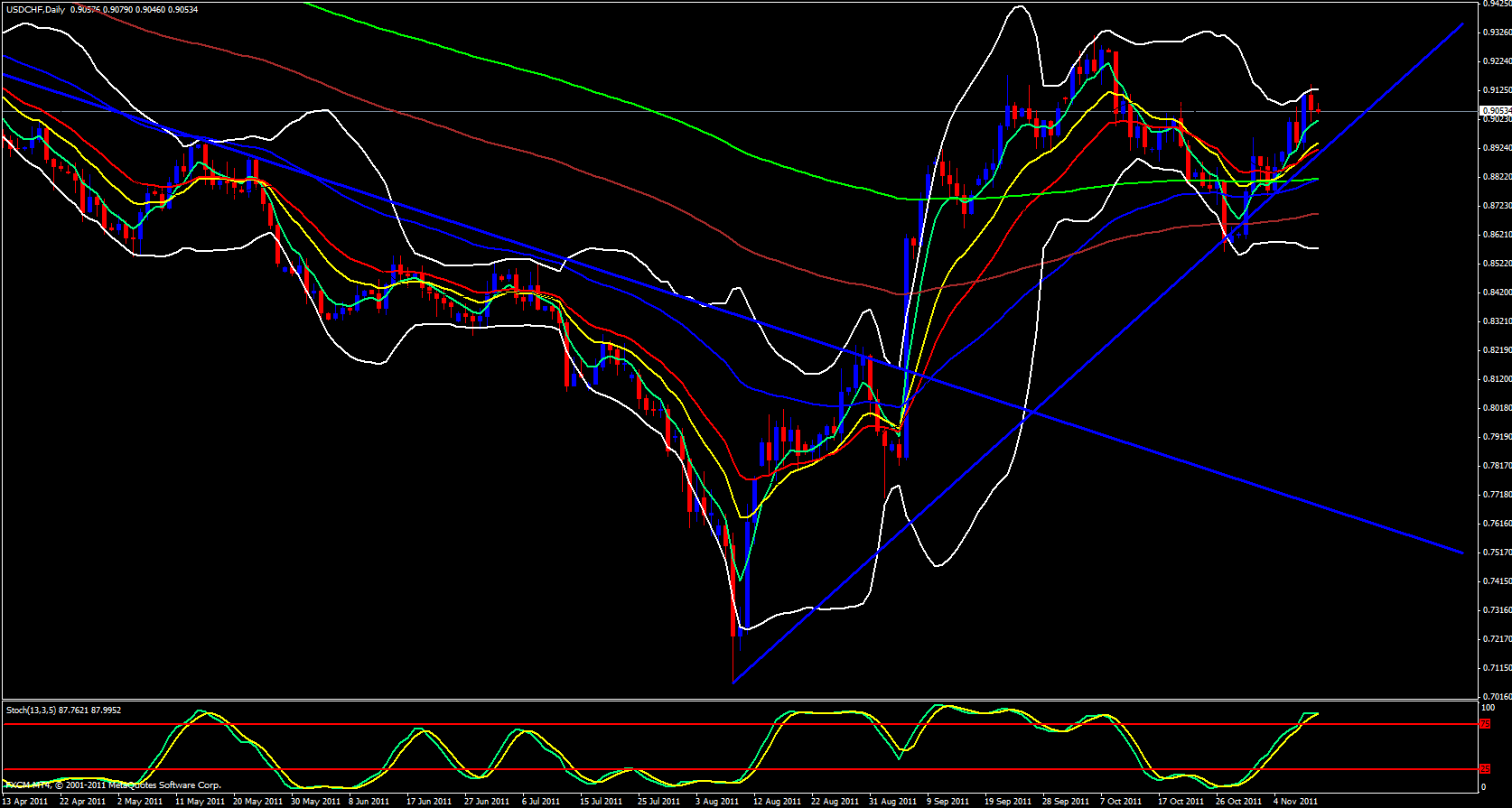 I will begin my analysis tonight for the Swissy with the daily timeframe. Price is riding the 5 ema to the upside and the Bollinger band is beginning to point up just a bit and the stochastics is pointing up.
