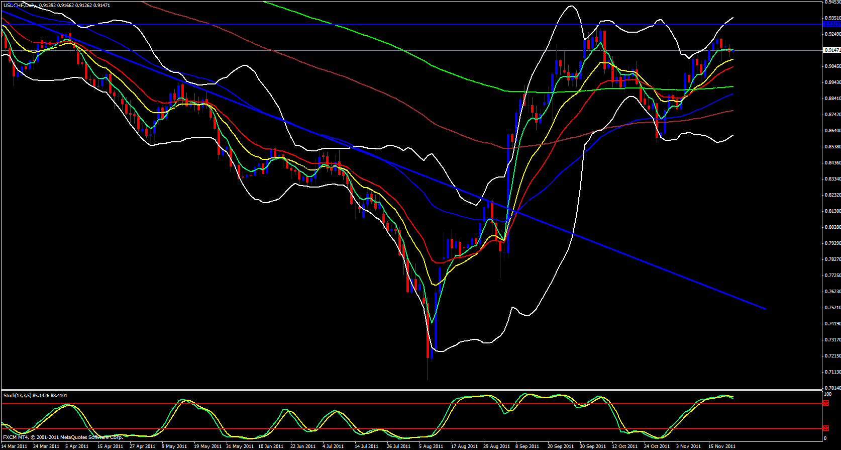 I will begin my analysis for the Swissy on the daily time frame. The daily 5 ema seems to be rolling over a bit and now has very little angle and separation between it and the 13 ema, however, price is still above the 13 ema so this pair is still in upside mode. A kiss of the 13 ema could send this pair upward a bit further, however, the stochastics does indicate this pair has been overbought.