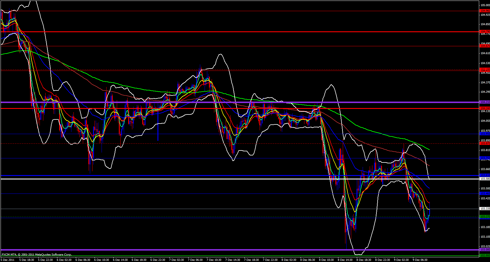 Moving on to the hourly time frame price is riding the 5 ema to the downside and the 5 ema has crossed below the 13 ema and the lower Bollinger band is pointing down. The weekly S1 pivot is at 103.02 and a bounce is expected at that level offering a small scalp to the upside then a good opportunity to enter a short position.