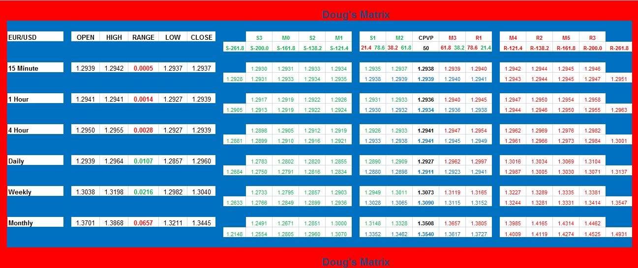 Included is my Support and Resistance table referred to as Doug's Matrix. Start with the higher timeframes and correlate the levels with the lower timeframes and it will get you into profitable trades and keep you out of the losing trades.